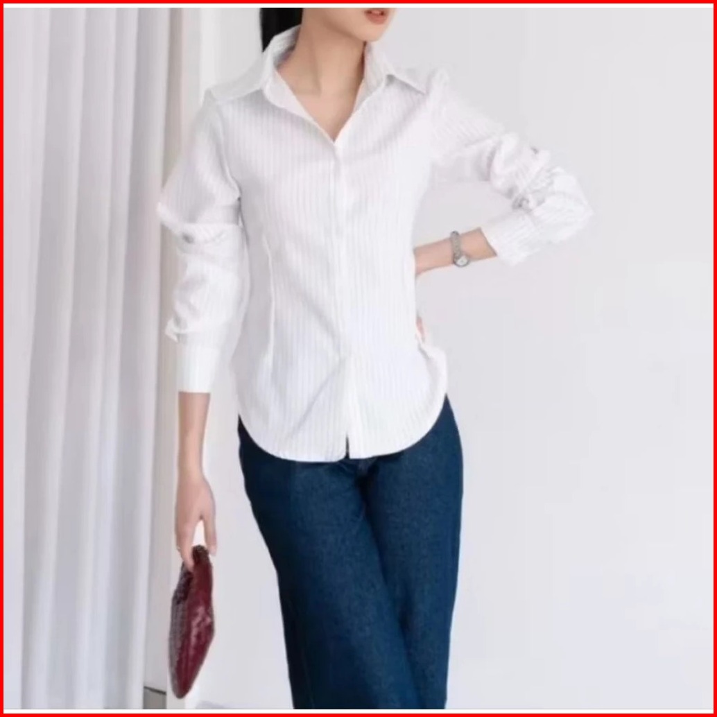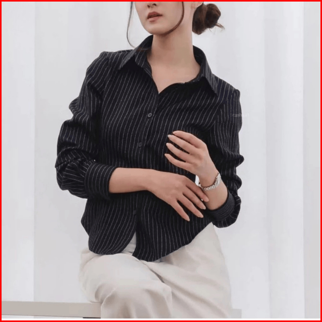 Kemeja Stripe Wanita Fitted Lengan Panjang Kantor Semiwol Motif Garis