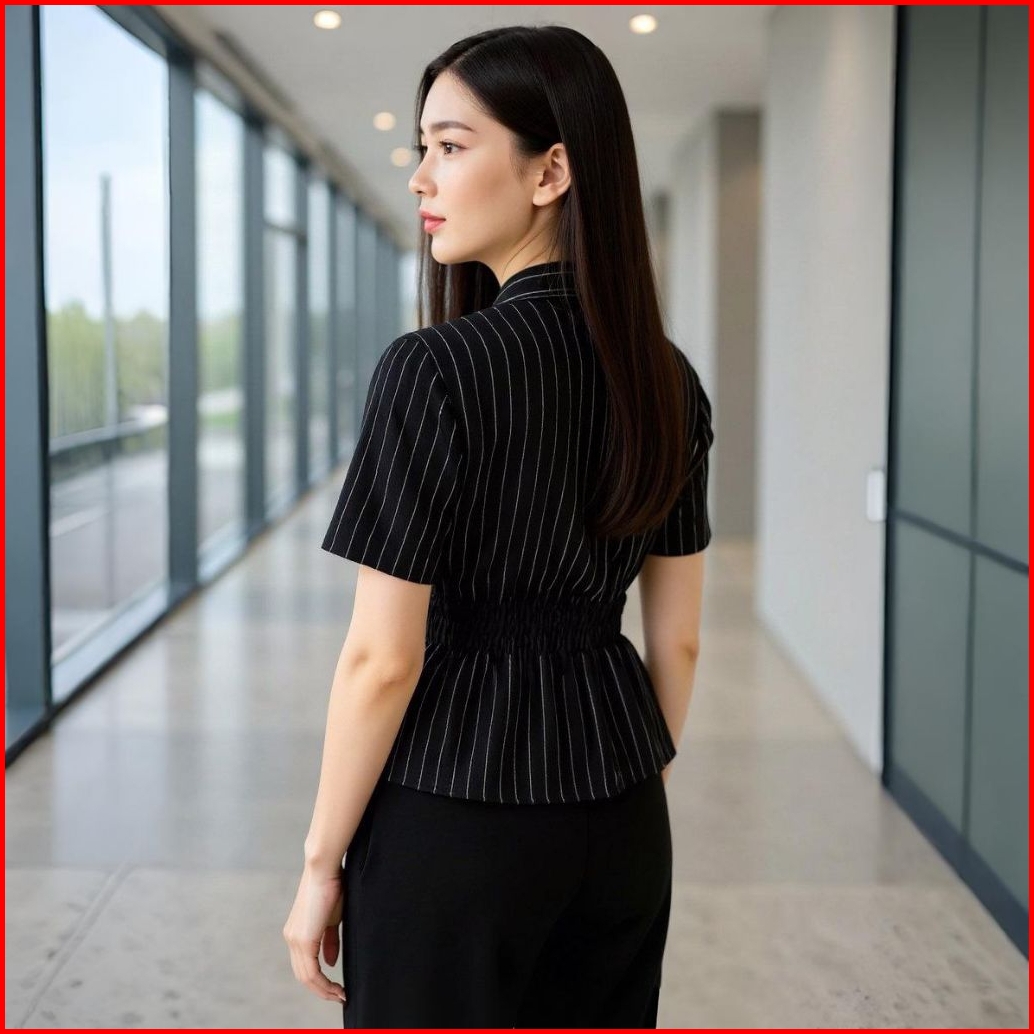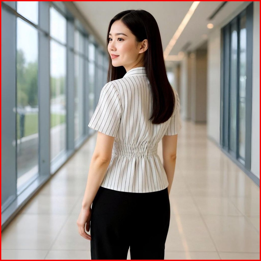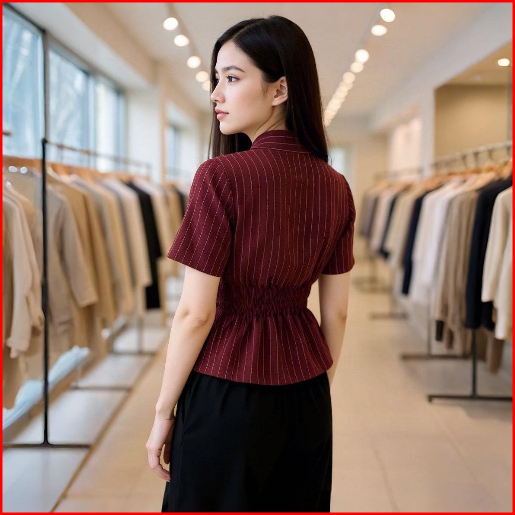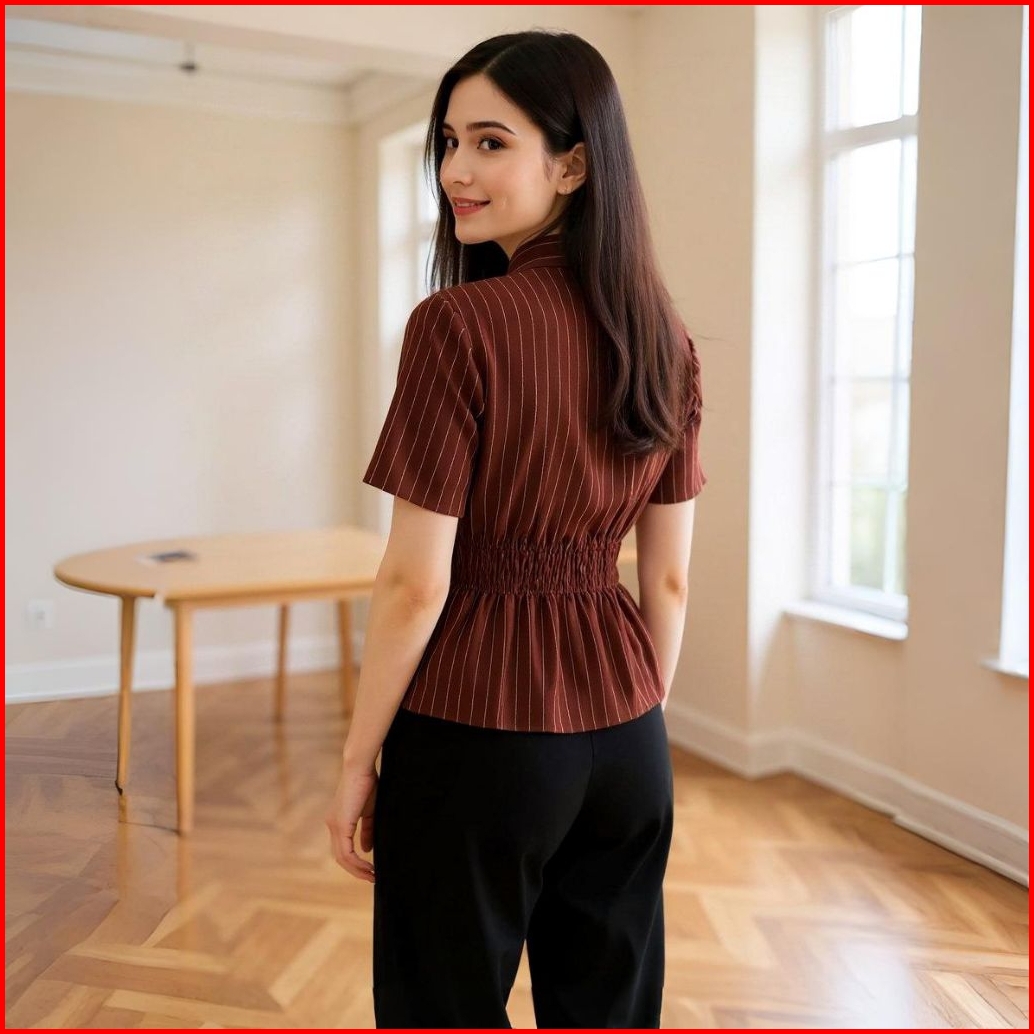 Kemeja Wanita Motif Salur Slim Fit Lengan Pendek Fitted Shirt Atasan Wanita Kekinian Bahan Adem