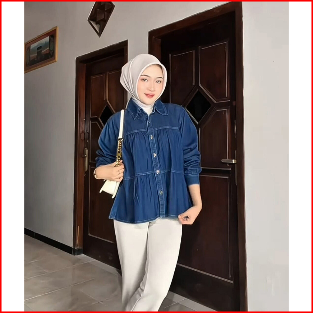 Atasan Wanita Blouse Jeans Ruffle Lengan Panjang Denim Shirt Flare Premium Dengan Desain Elegan Dan Stylish Alea