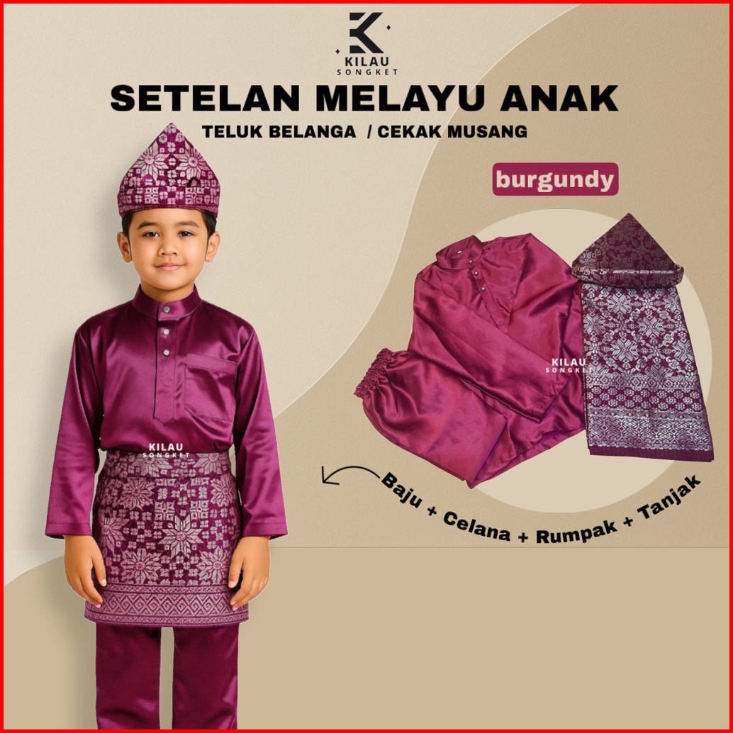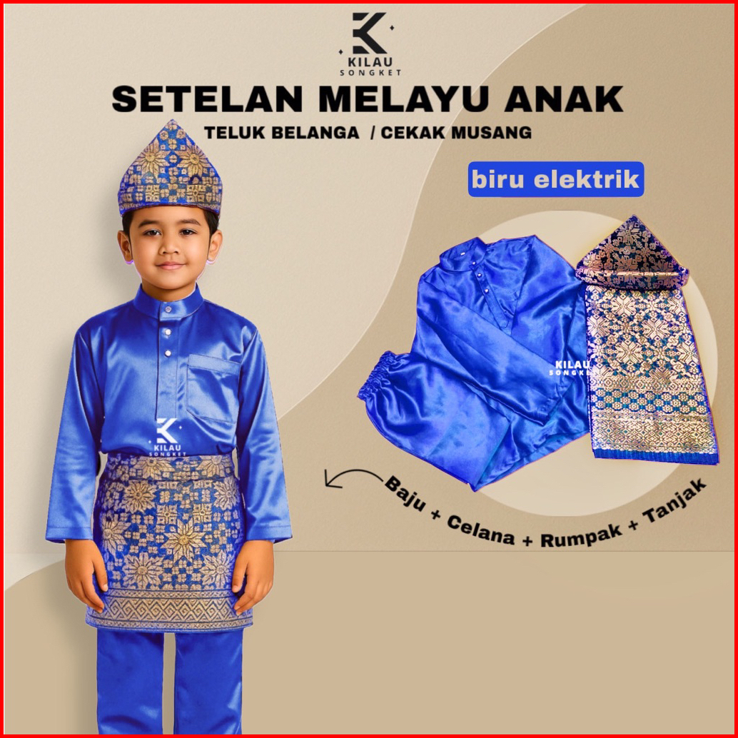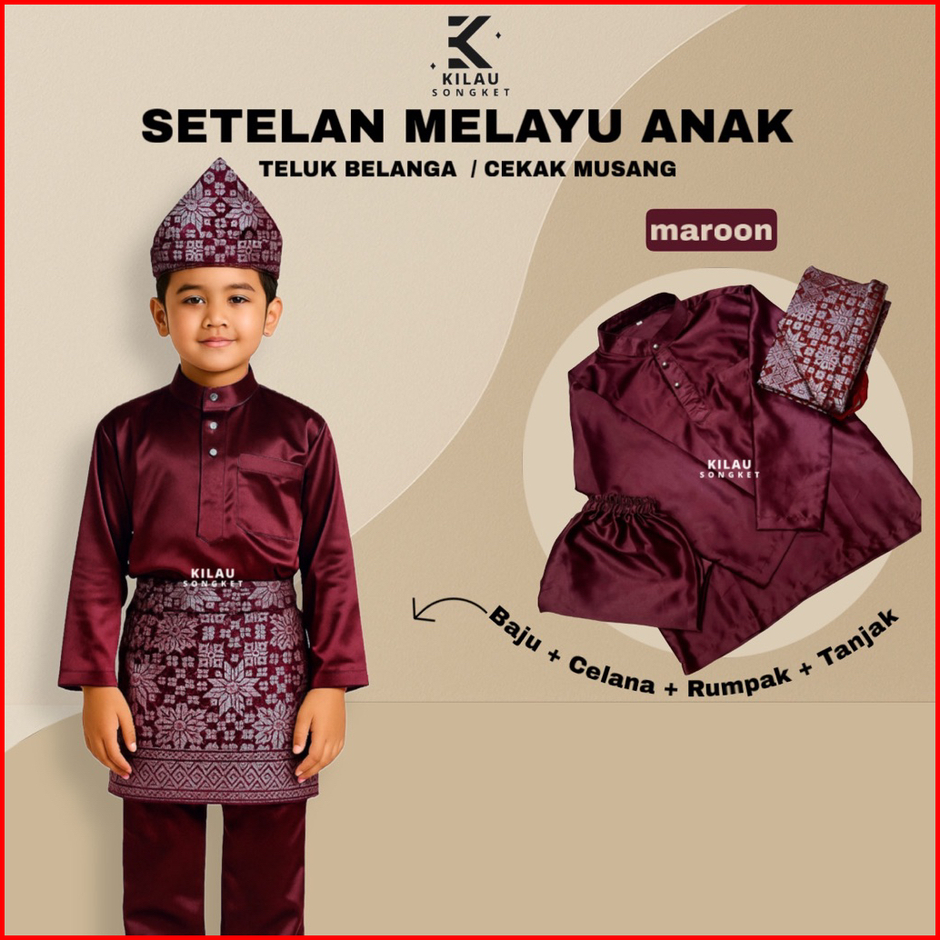 Setelan Melayu Anak Baju Celana Cekak Musang Teluk Belanga Dengan Rumpak Tanjak Songket