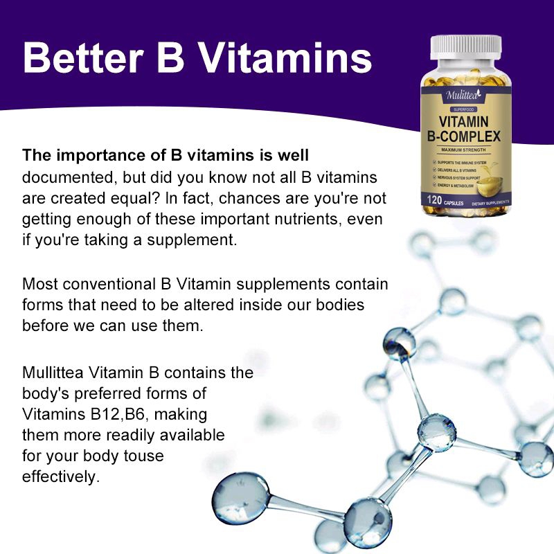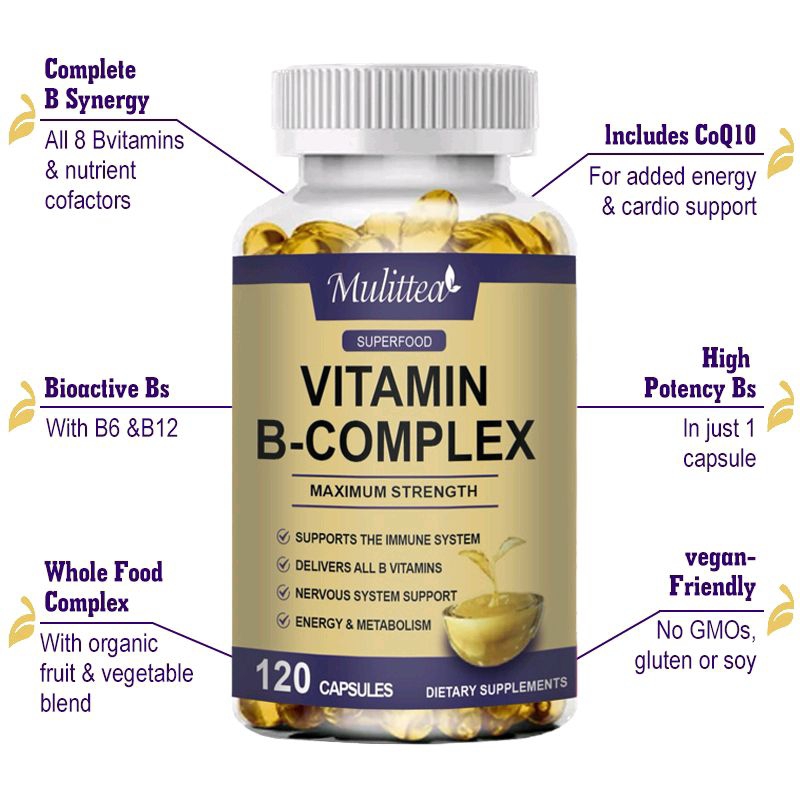Mulittea Vitamin B Complex Capsule (B12, B1, B2, B3, B5, B6, B7, B9, Folic Acid & Biotin) 120pcs Reduce Stress