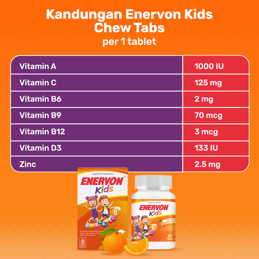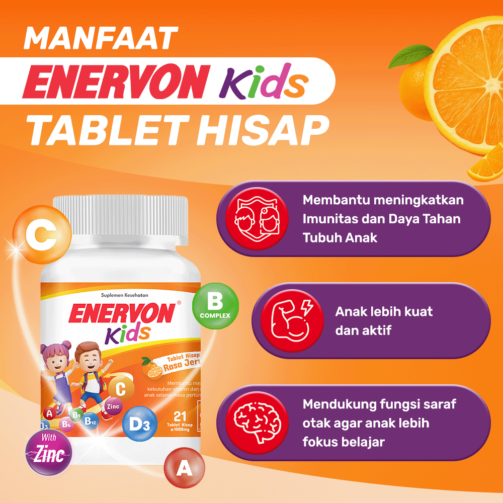 [BARU] Enervon Kids Tablet Hisap rasa jeruk (1 botol x 21 Tablet) - Multivitamin Anak-Vitamin C, A, B Complex, D3 plus Zinc - Membantu Memeliharan Vitamin dan Mineral Anak dimasa Pertumbuhan