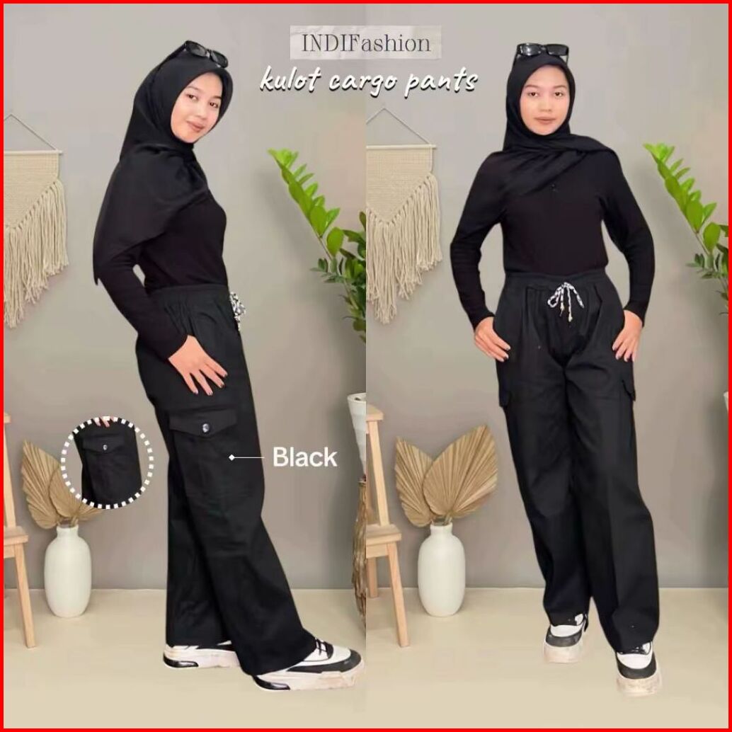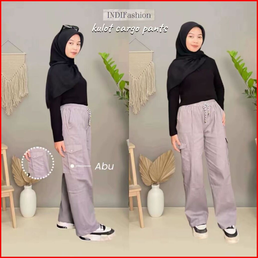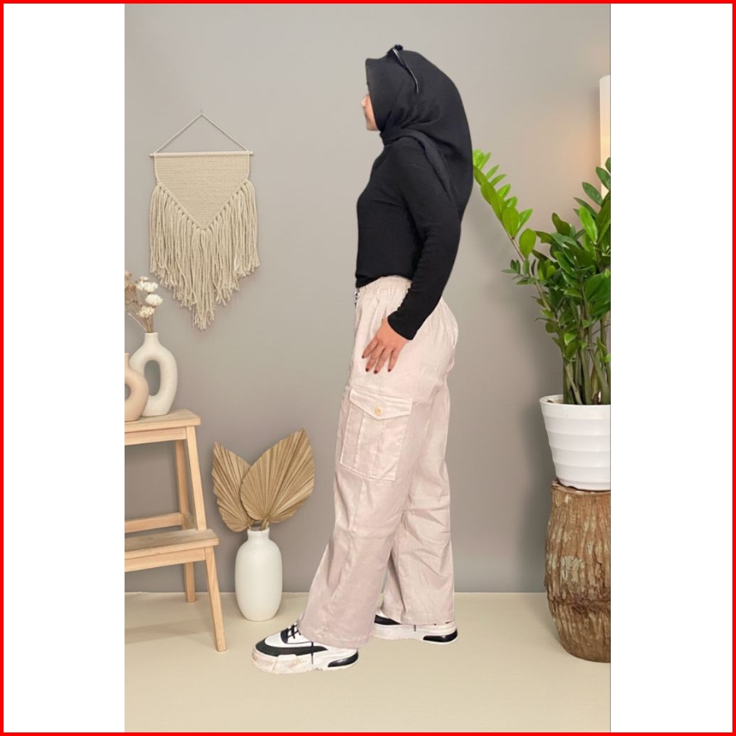 Celana Kulot Cargo Highwaist Wanita Kekinian Pinggang Karet Ada Tali Serut Twill Combed Pants