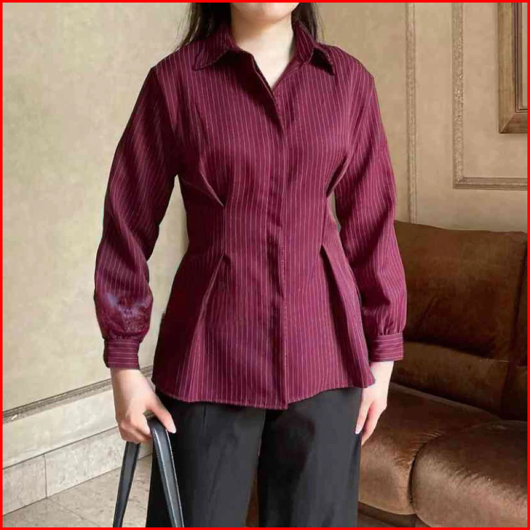 Atasan Wanita Lengan Panjang Slim Fit - Kemeja Stripe Wanita Fitted Body Basic Casual Bahan Semiwoll