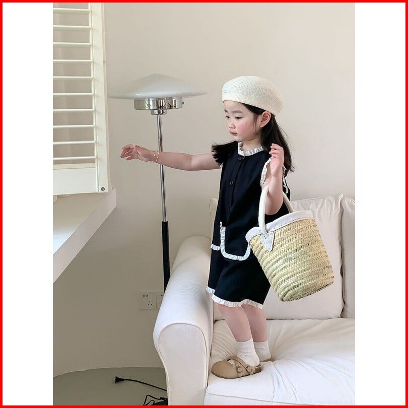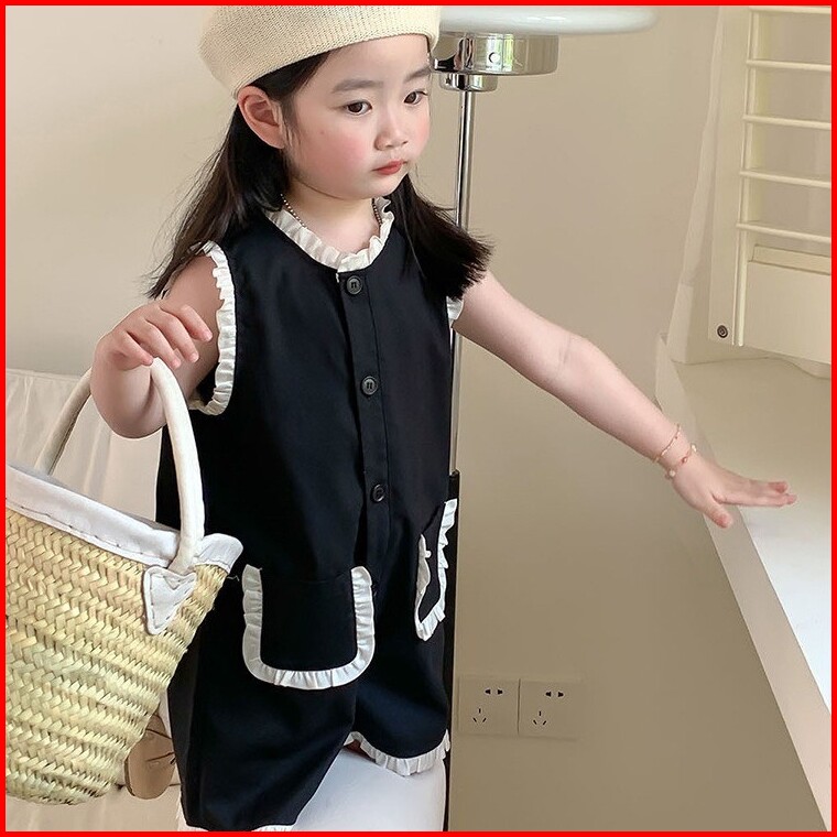 Setelan Anak Perempuan Import Model Jumpsuit Tanpa Lengan Renda 2 Kantong Depan Kancing Terbaru