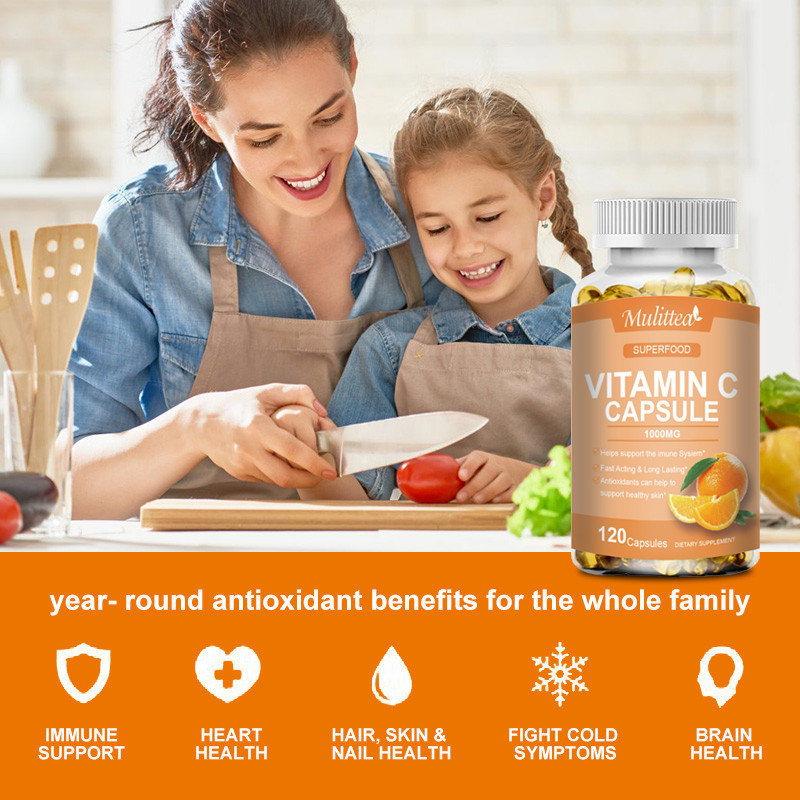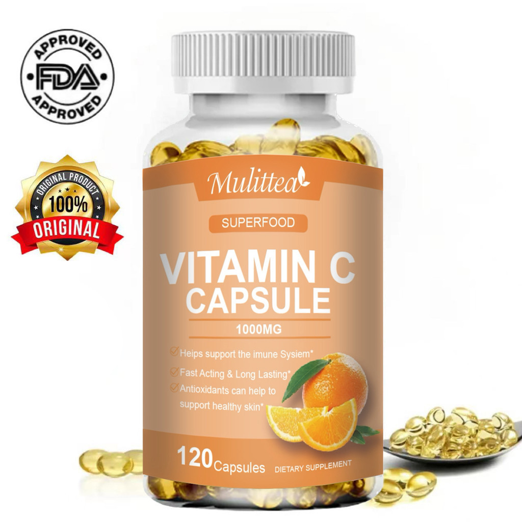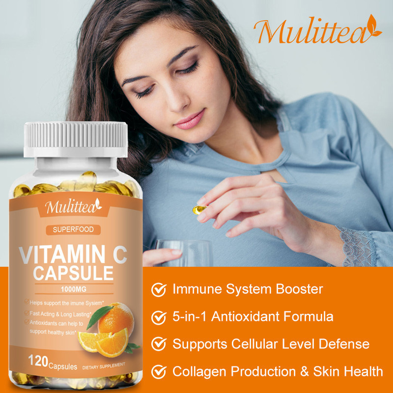 Mulittea Vitamin C 1000 mg Capsules/ Ascorbic Acid Support Immune System Strong Antioxidant Anti-aging 120pcs Kapsul Vitamin C Asam Askorbat Mendukung Sistem Kekebalan Tubuh Antioksidan Anti Penuaan