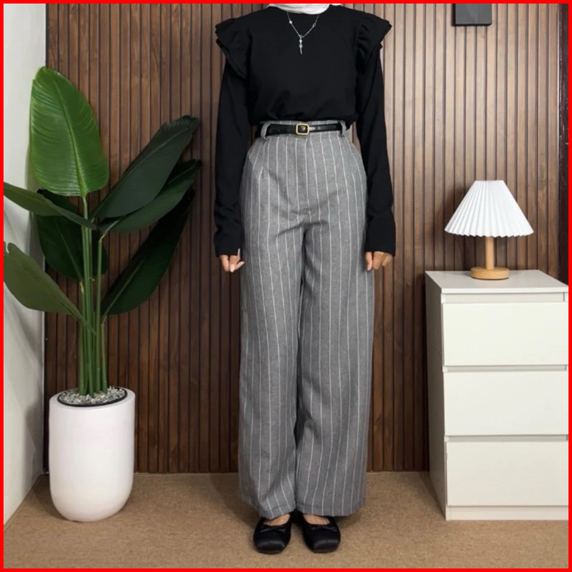 Jva.id Loose Pants Stripe Trouser Wanita - Celana Anti Kusut - Celana Kulot Wanita Motif Stripe Bahan Semi Woll - Celana