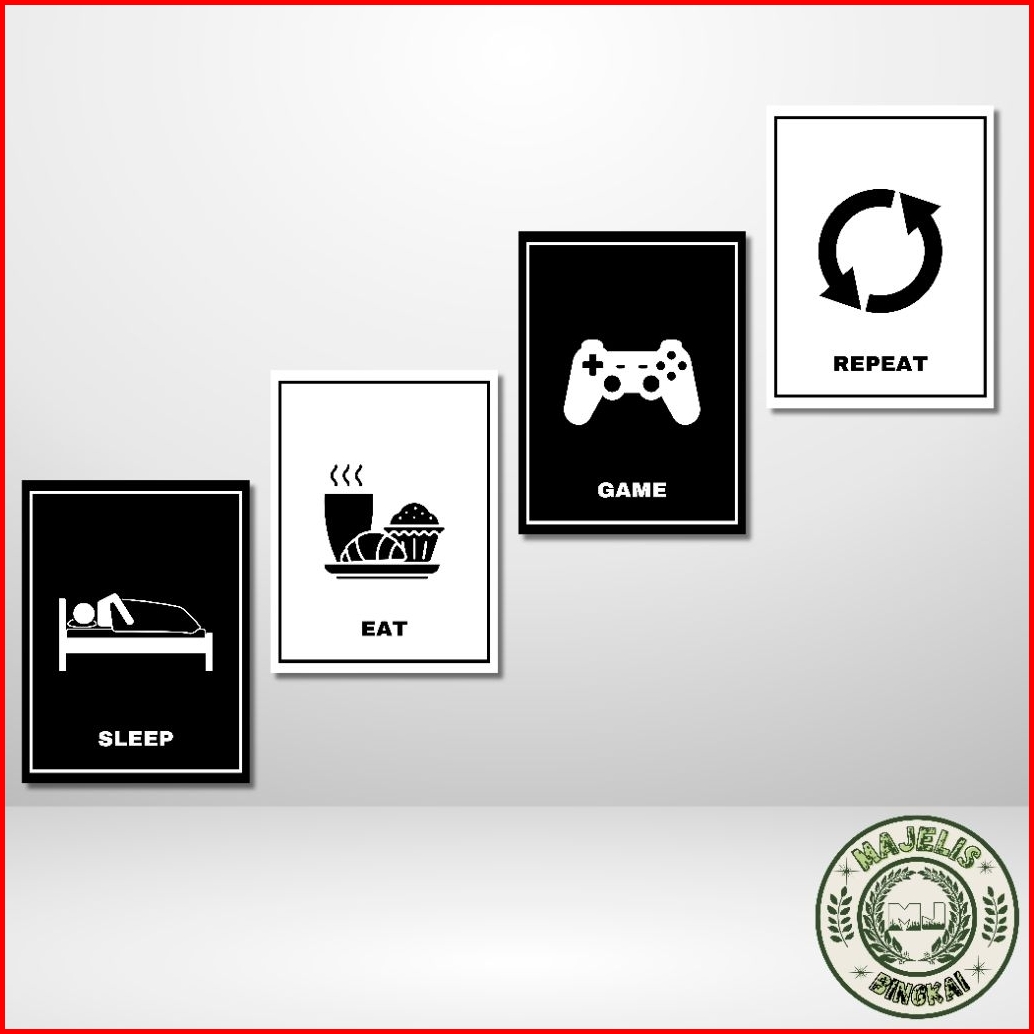 Hiasan Dinding Kamar Aesthetic. Poster Dinding Game Sleep Eat Repeat. Bahan Kayu 1set 4pcs