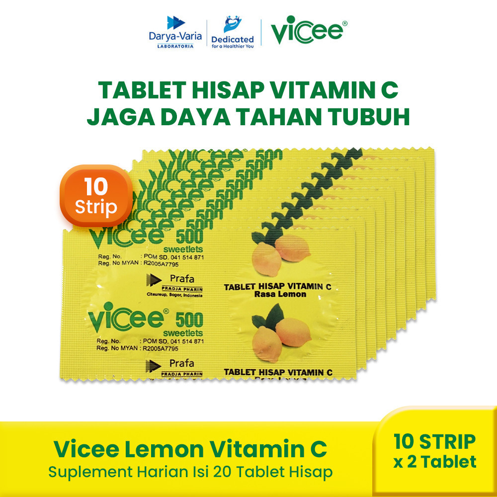 Vicee Lemon Vitamin C 500 mg Isi 20 Tablet Hisap (10 Strip x 2 Tablet Hisap) - Suplemen Harian untuk Kesehatan dan Daya Tahan Tubuh