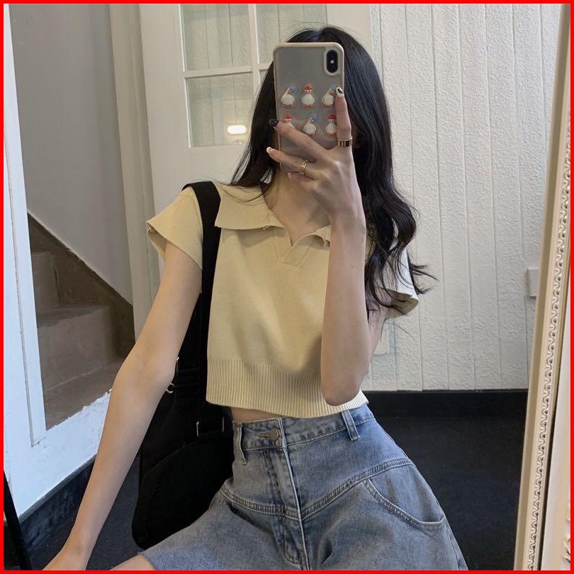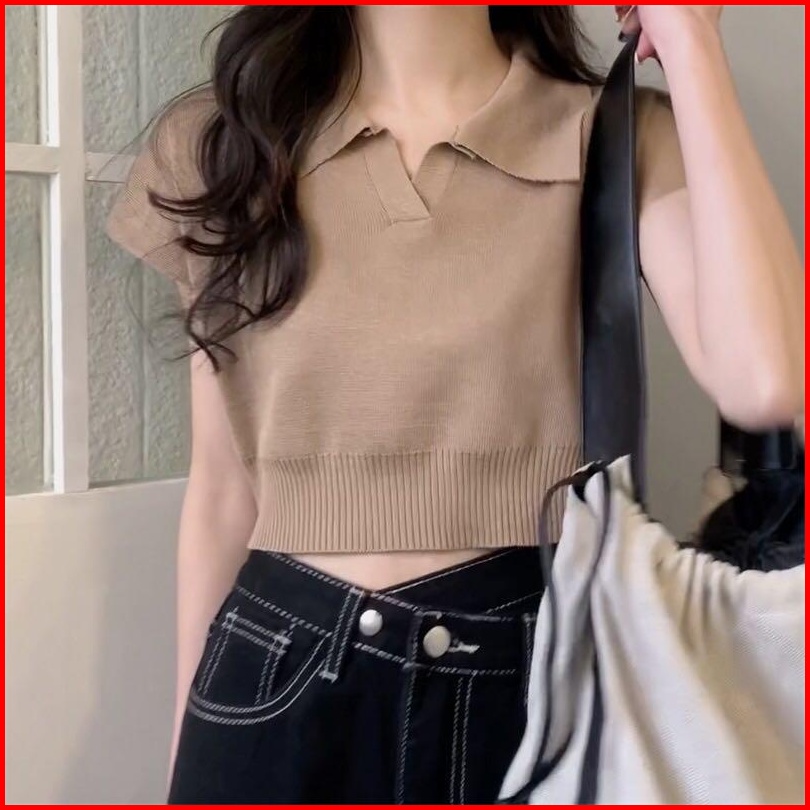 Crop Top Rajut Kaos Kerah Polo Wanita Crop Kerah Lengan Pendek
