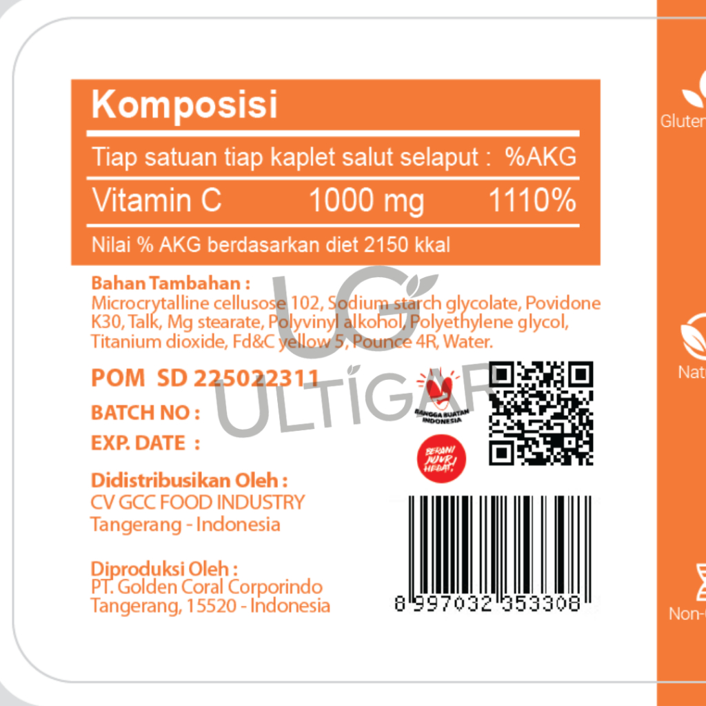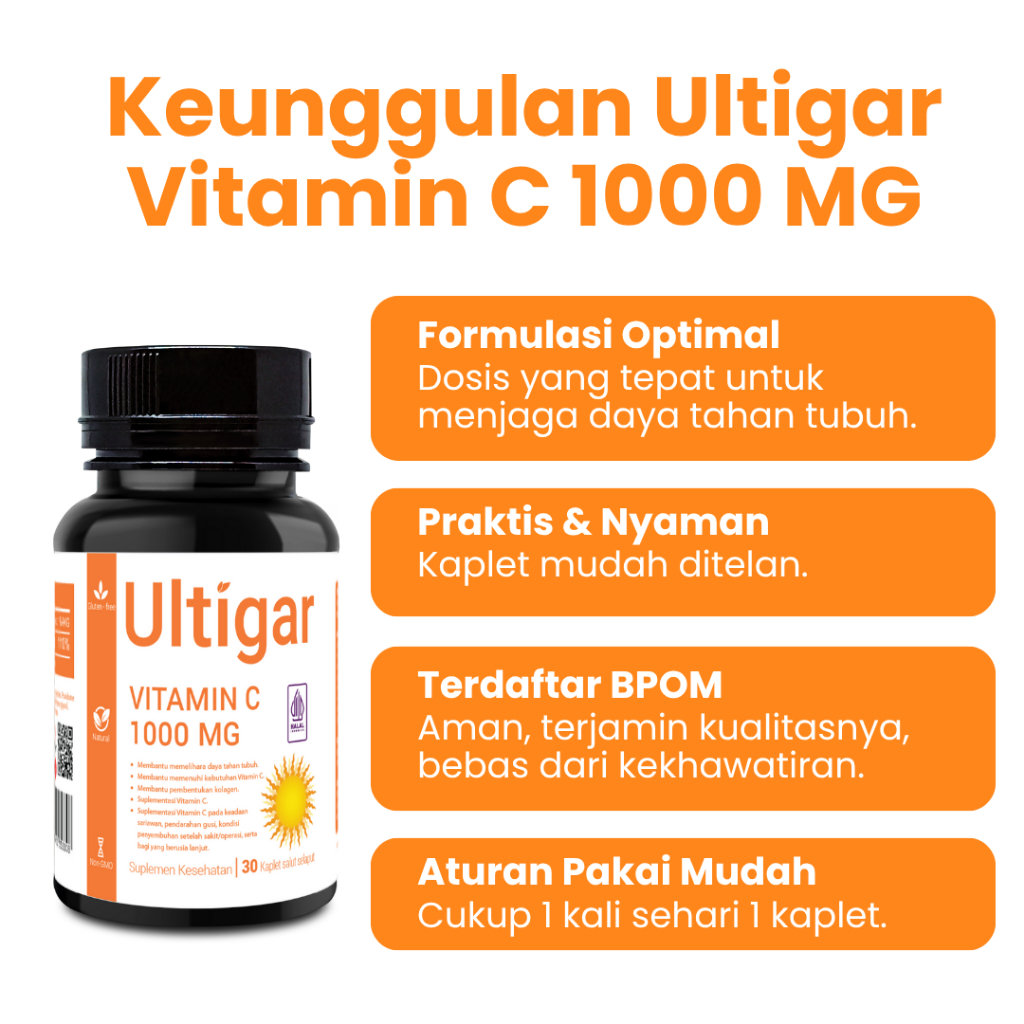 Ultigar Vitamin C 1000 mg - Botol isi 30 Kaplet Salut Selaput - Vitamin C 1000 mg - Suplemen Kesehatan