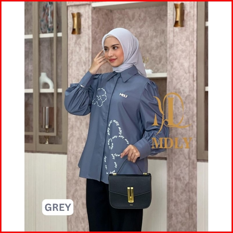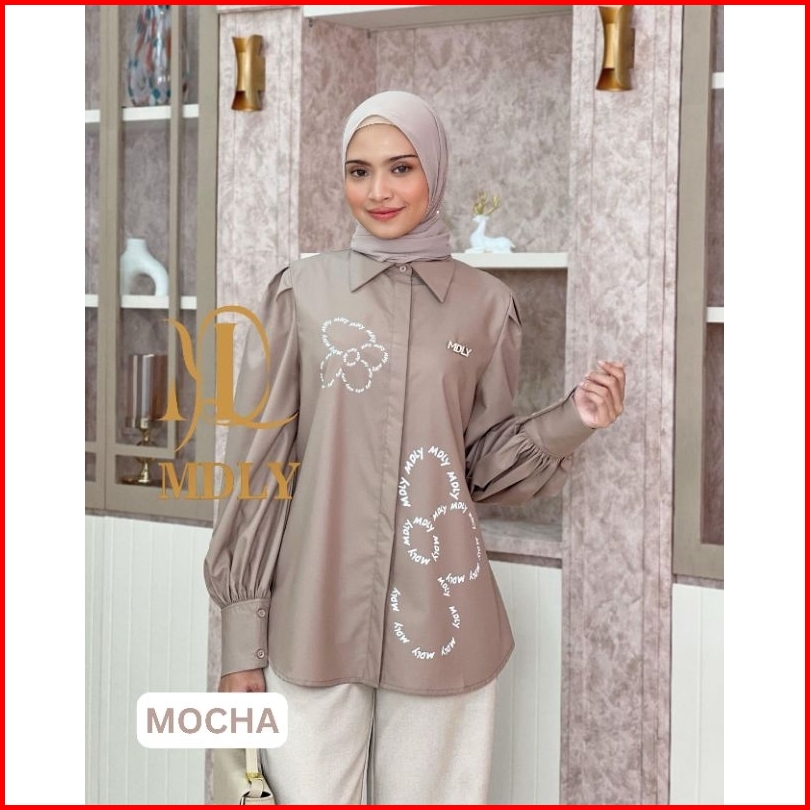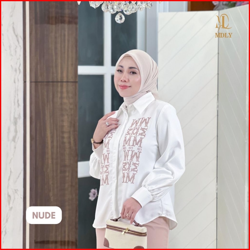 Mdly Muse Monogram Seniya Signature Shirt Atasan Wanita Kemeja Lengan Panjang Casual Motif Print