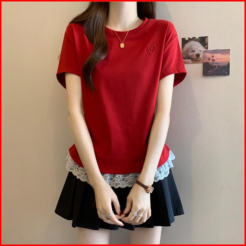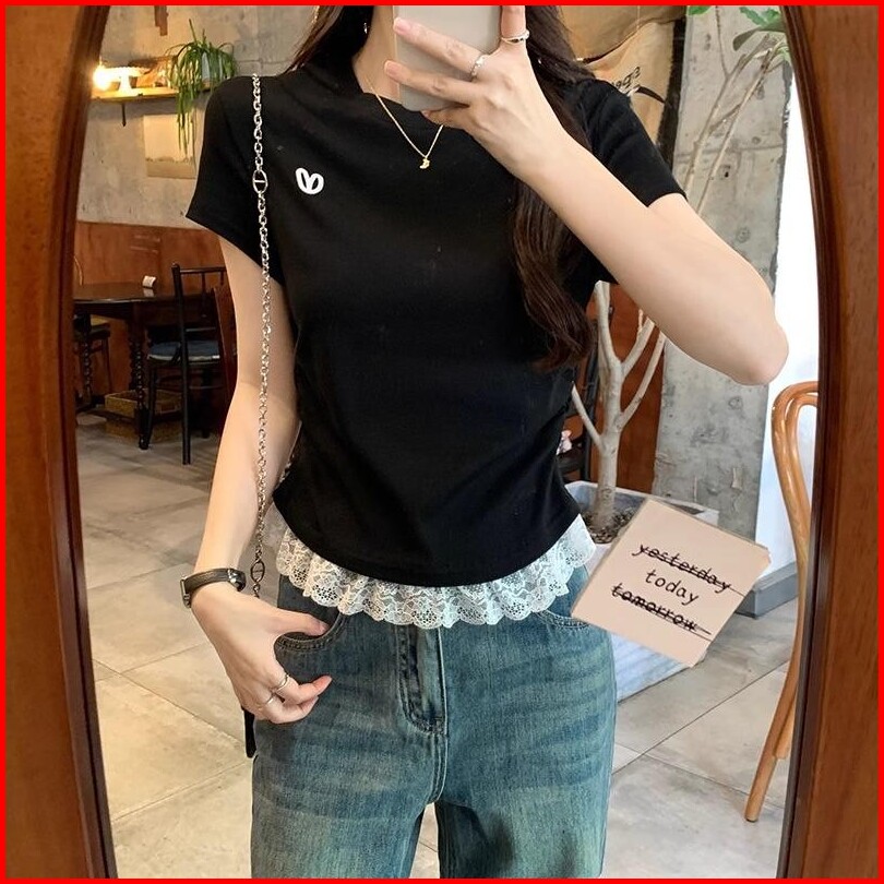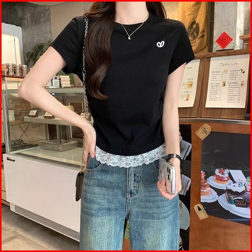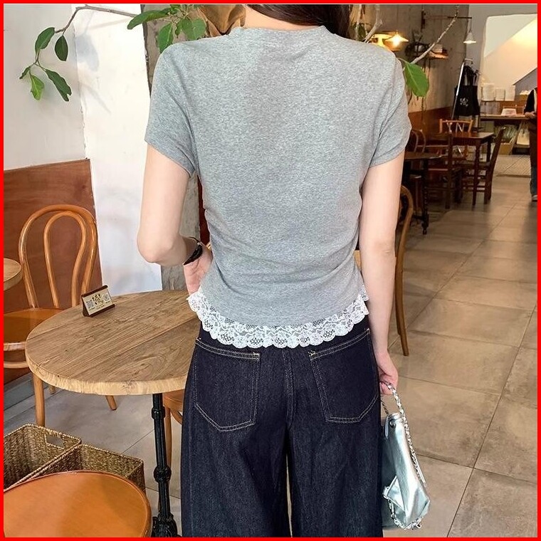 Kaos Crop Top Lengan Pendek Tepi Bunga Berenda Bordir Abu-abu