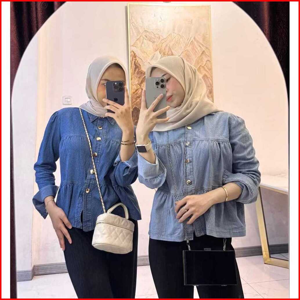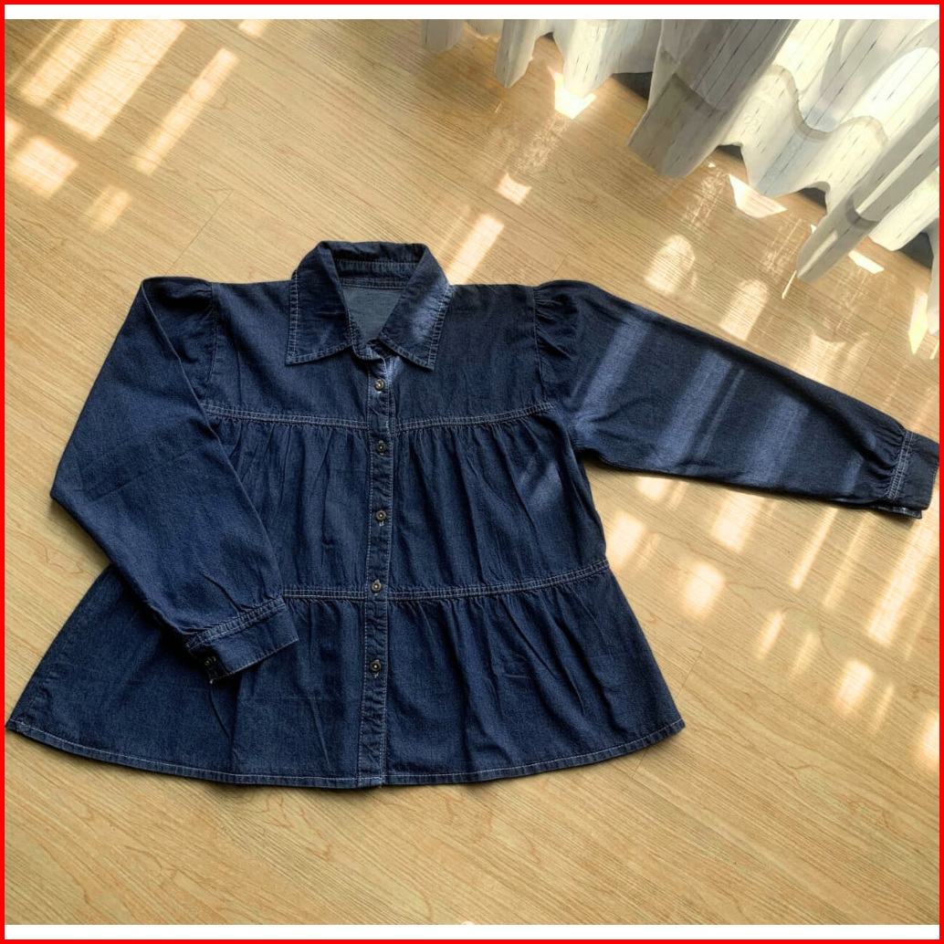 Atasan Wanita Blouse Jeans Ruffle Lengan Panjang Denim Shirt Flare Premium - Alea