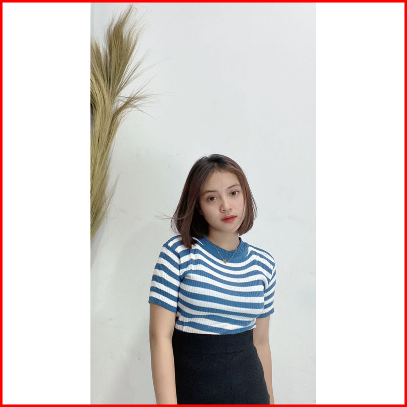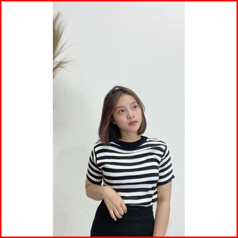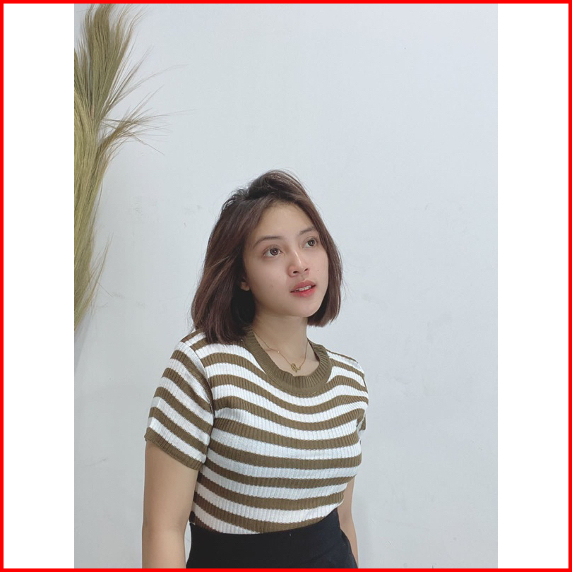 Blouse Rajut Salur Atasan Wanita Stripe Lengan Pendek