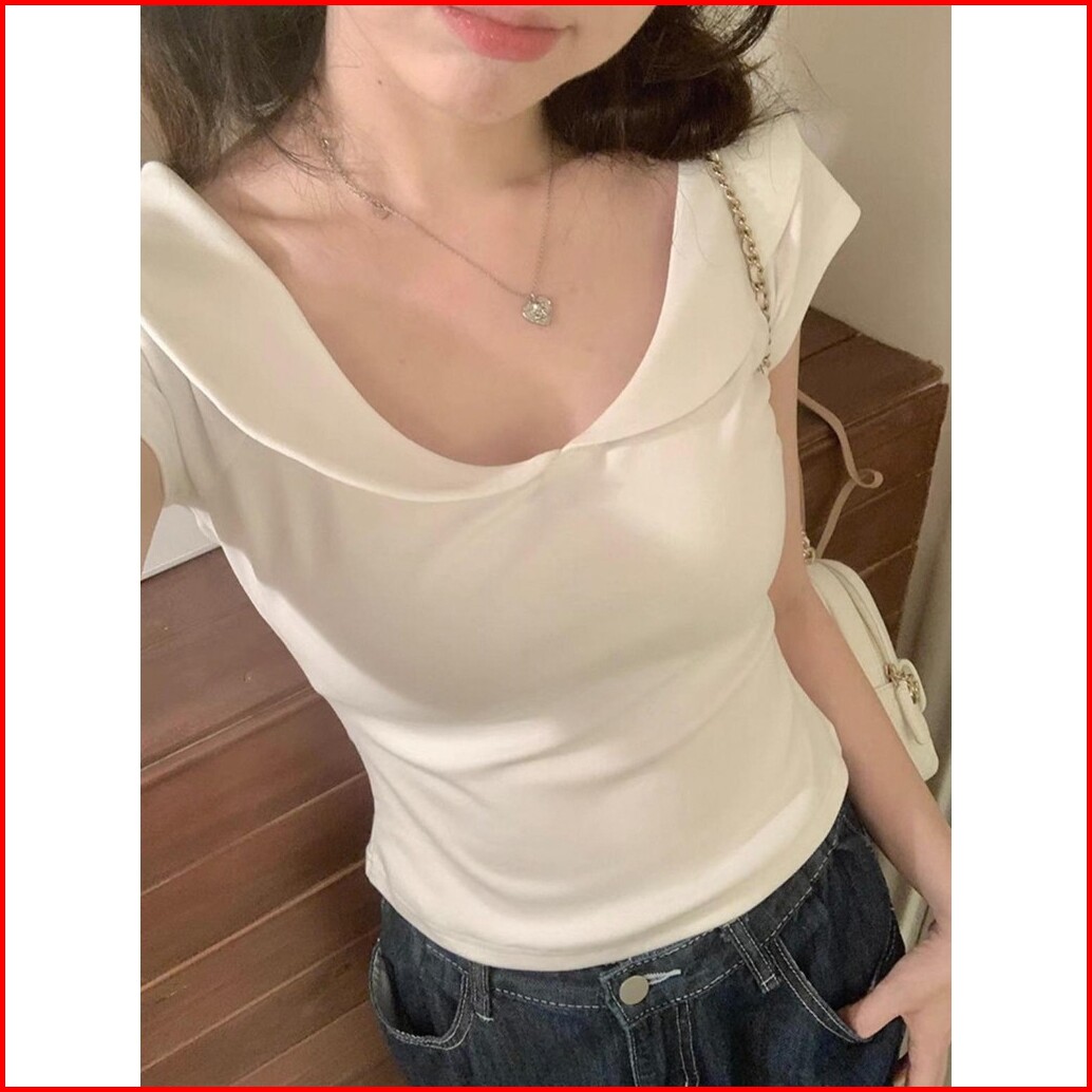 Kaos Apricot Polos Lucu Wanita T Shirt Kerah Boneka Cewek Lengan Pendek Bahu Crop Top S-xl Baju Korean Style Serbaguna