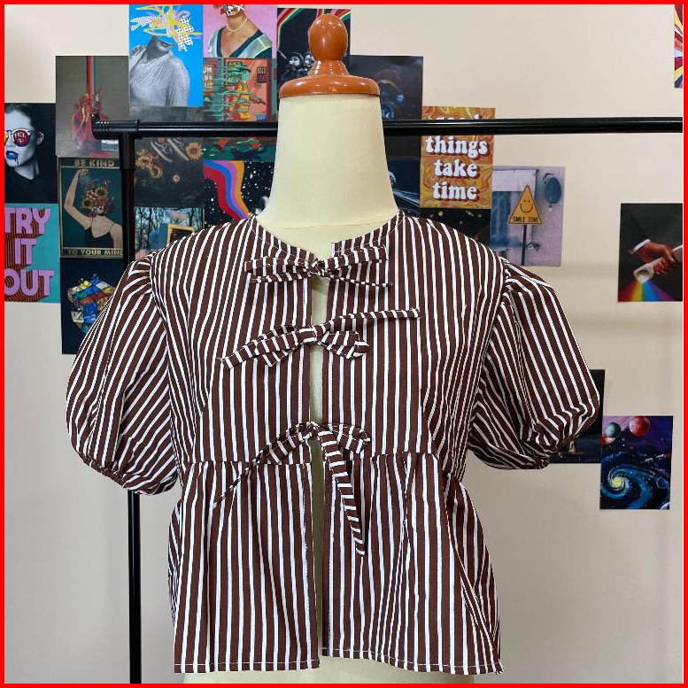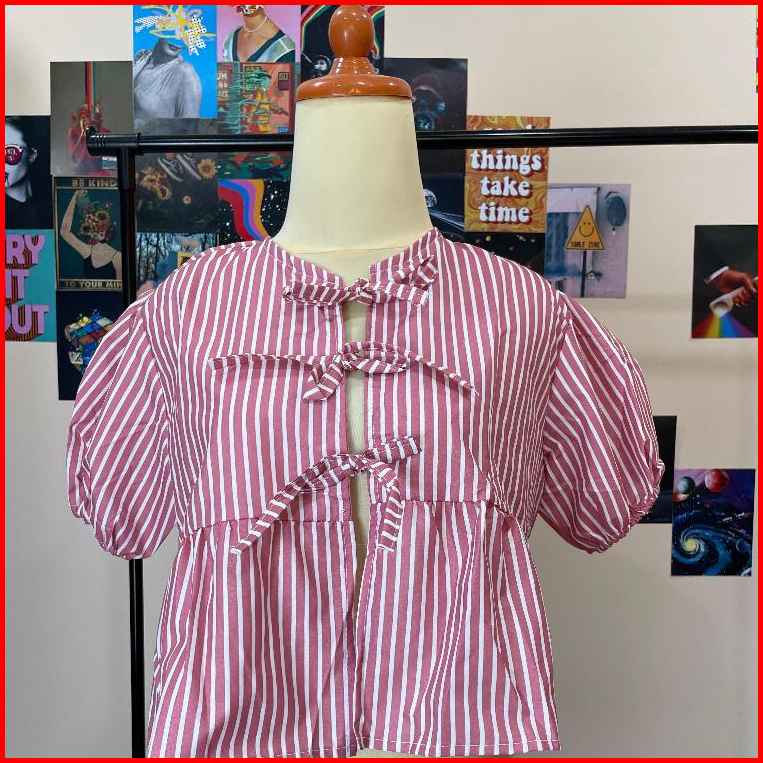 Glam Jane Top - Atasan Wanita Coquette Blouse Korea Ribbon Top Coquette Top Baju Crop Katun Salur Lengan Puff 3 Pita Man