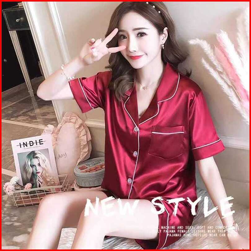 Rulif Piyama Baju Tidur Wanita Bahan Satin Fashion Pendek Set Hp Satin