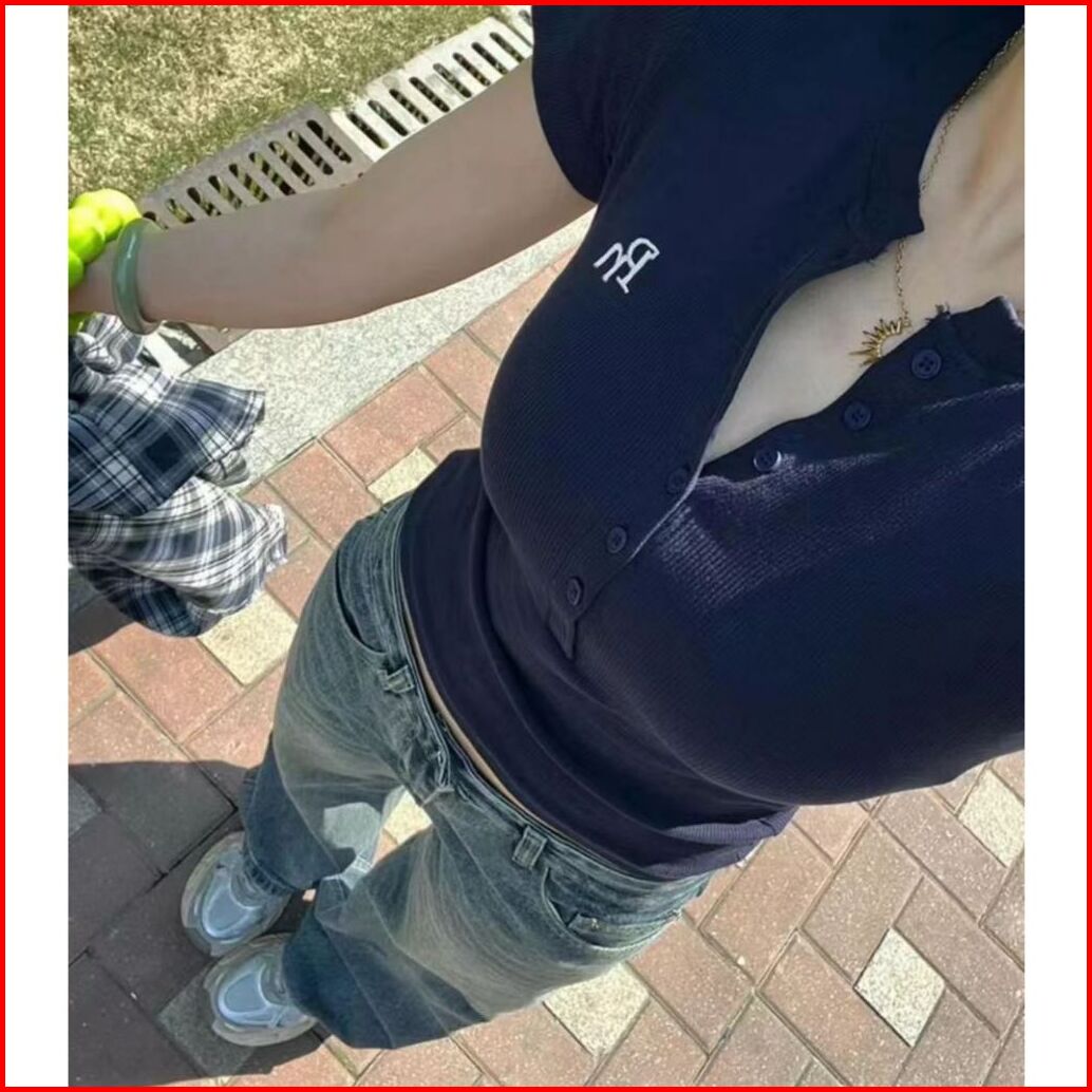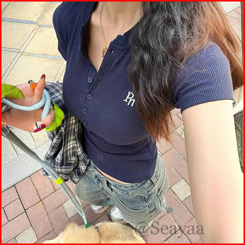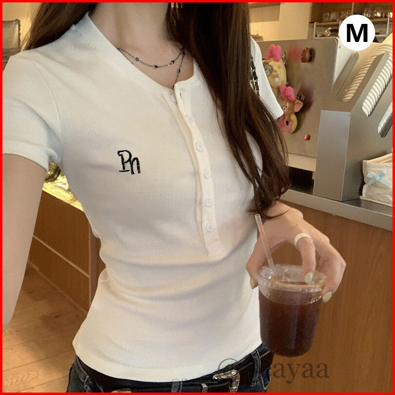 Blus Wanita Korea Kerut Button Embroidery Lengan Pendek Slim Fit Casual