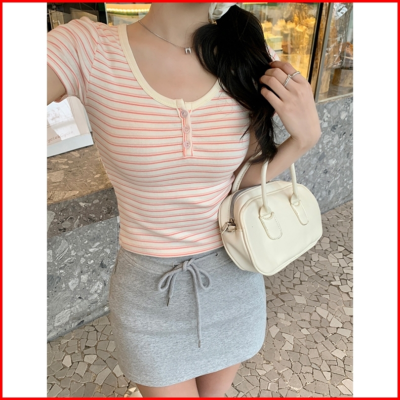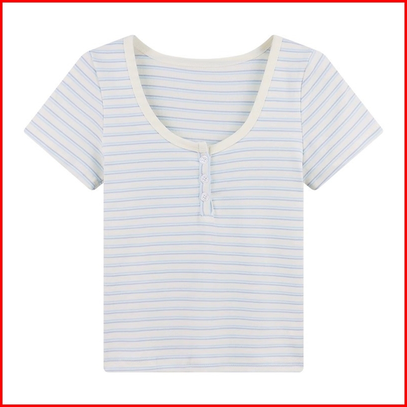 Kaus Kerah Setengah Terbuka Desain Garis Warna Kontras Atasan Lengan Pendek Ramping Gaya Korea Terbaru Wanita Kualitas T
