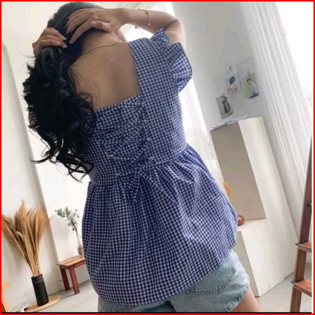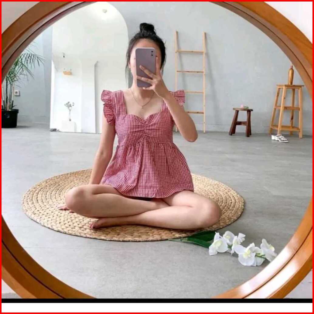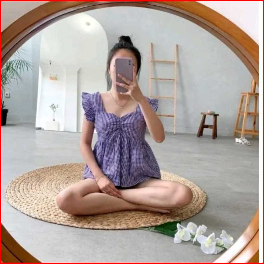 Thea Top Atasan Model Ruffel Lengan Pendek Model Kotak Kotak Korea Style