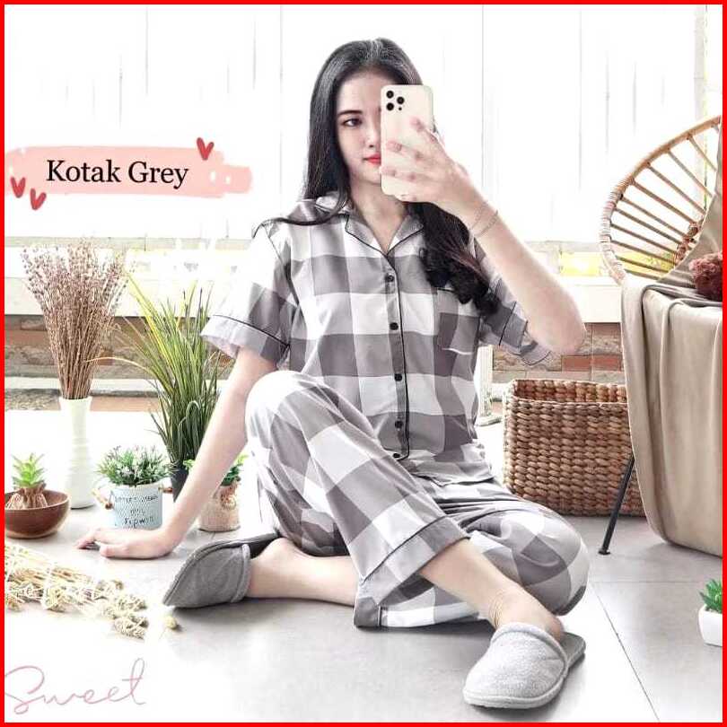 Piyama Cp Wanita Dewasa Setelan Baju Tidur Lengan Pendek Kotak-kotak