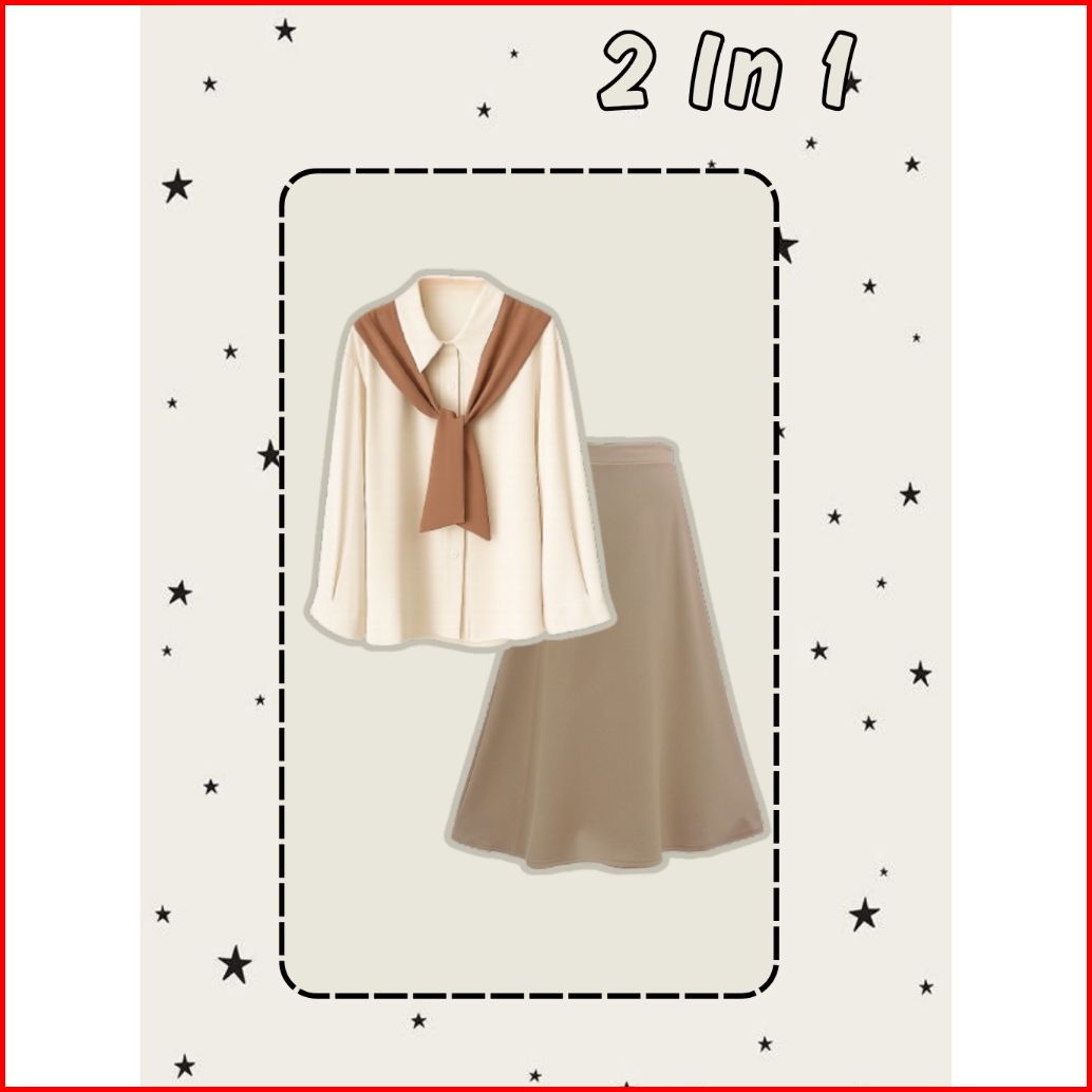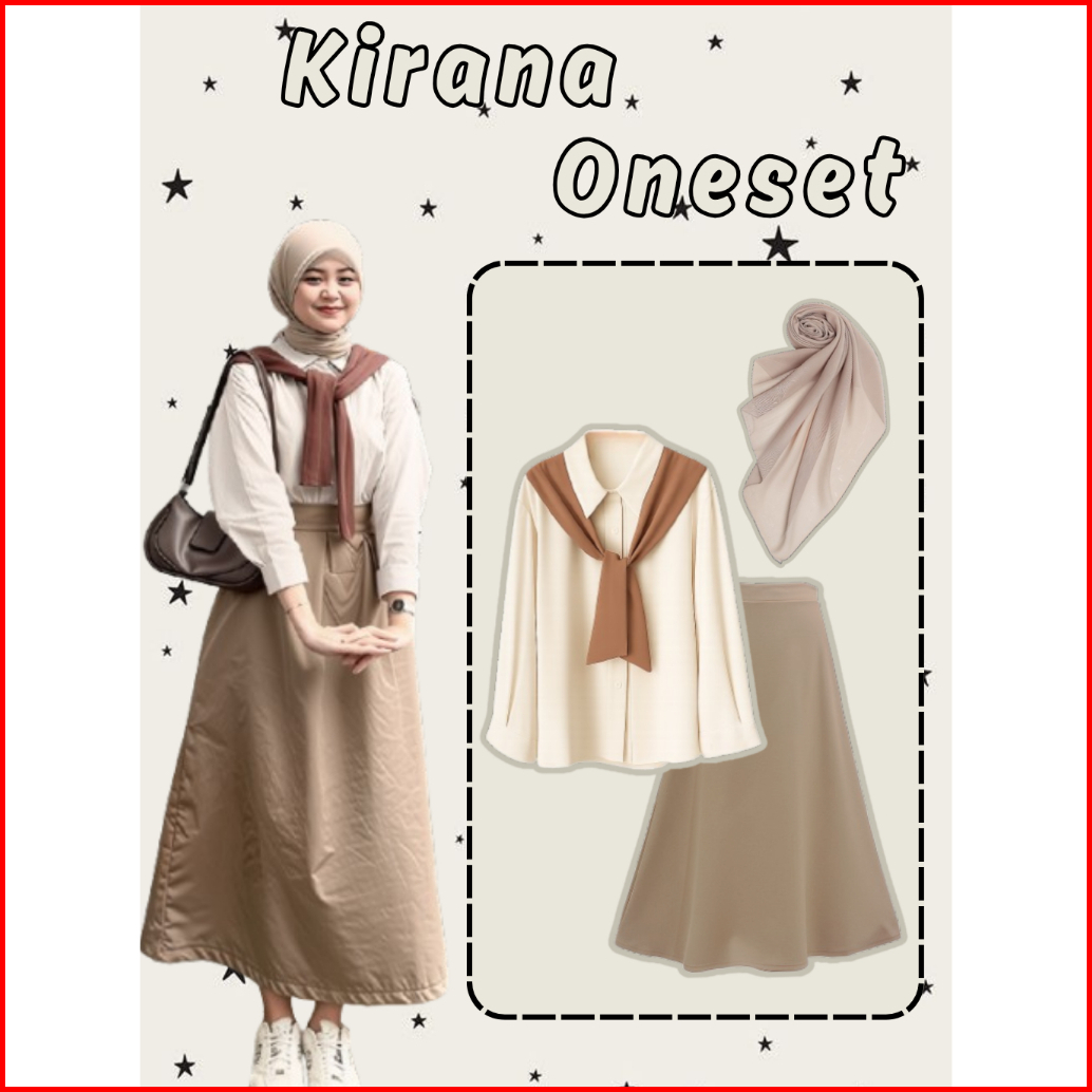3 In 1 Kirana Set Blouse Rok A Line Outfit Hijab Casual Cream Mocha Tampil Stylish Sehari-hari