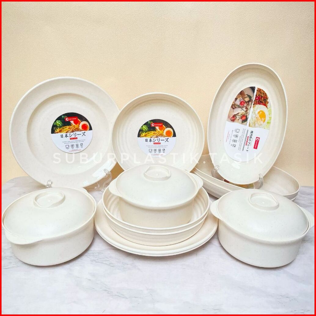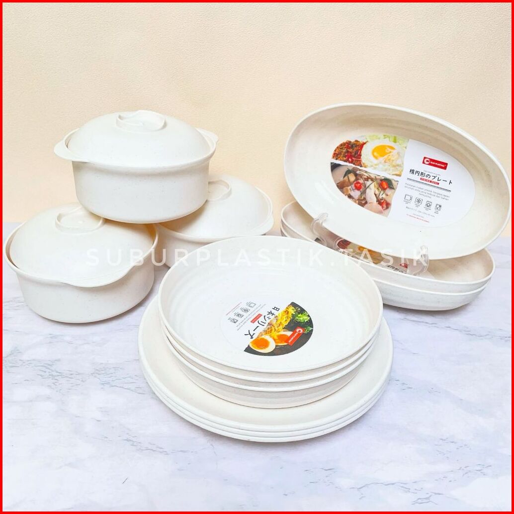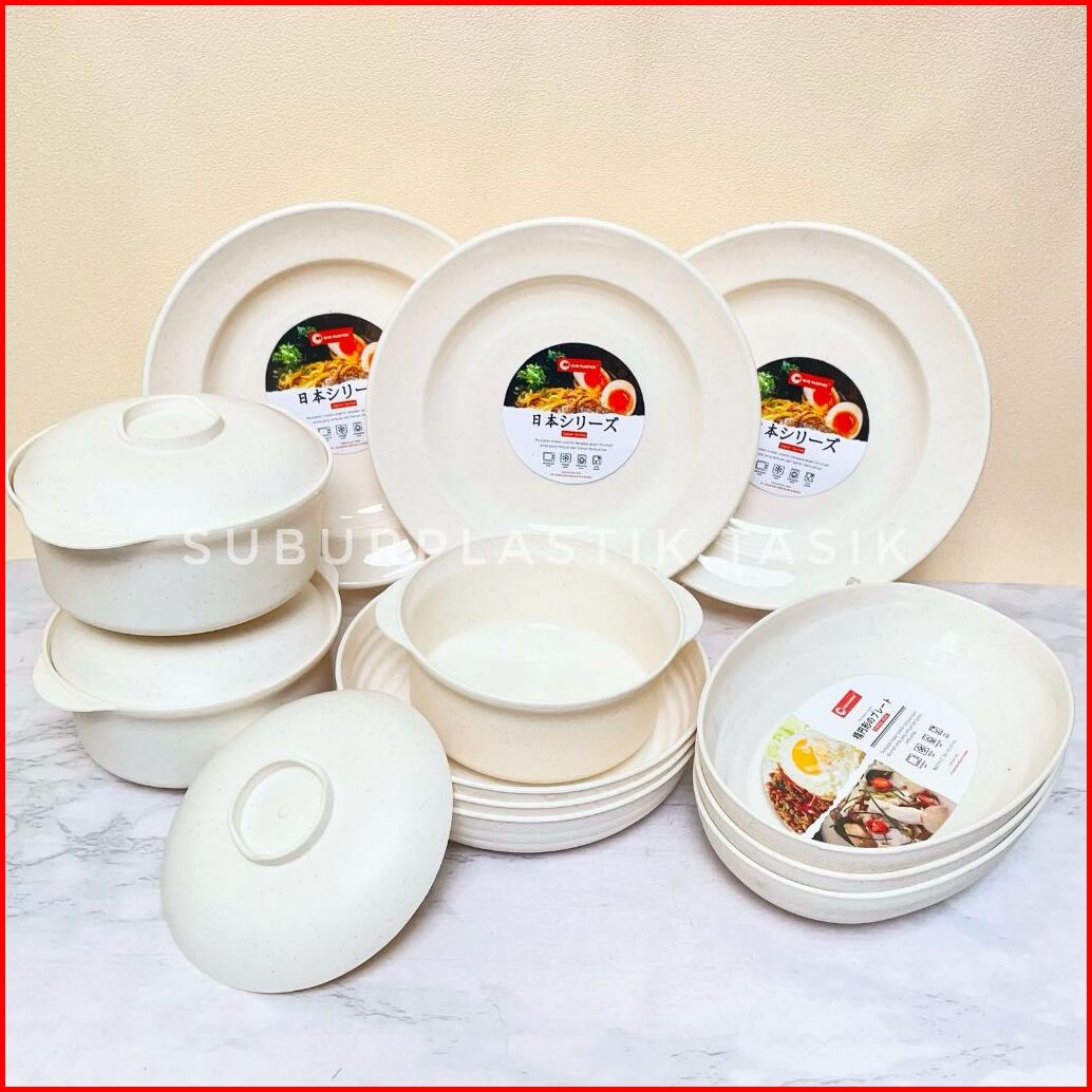 Paket 1 Lusin Japan Series Putih Mangkok Piring Sajian Makanan Set Plastik Motif Jerami Gandum Tebal
