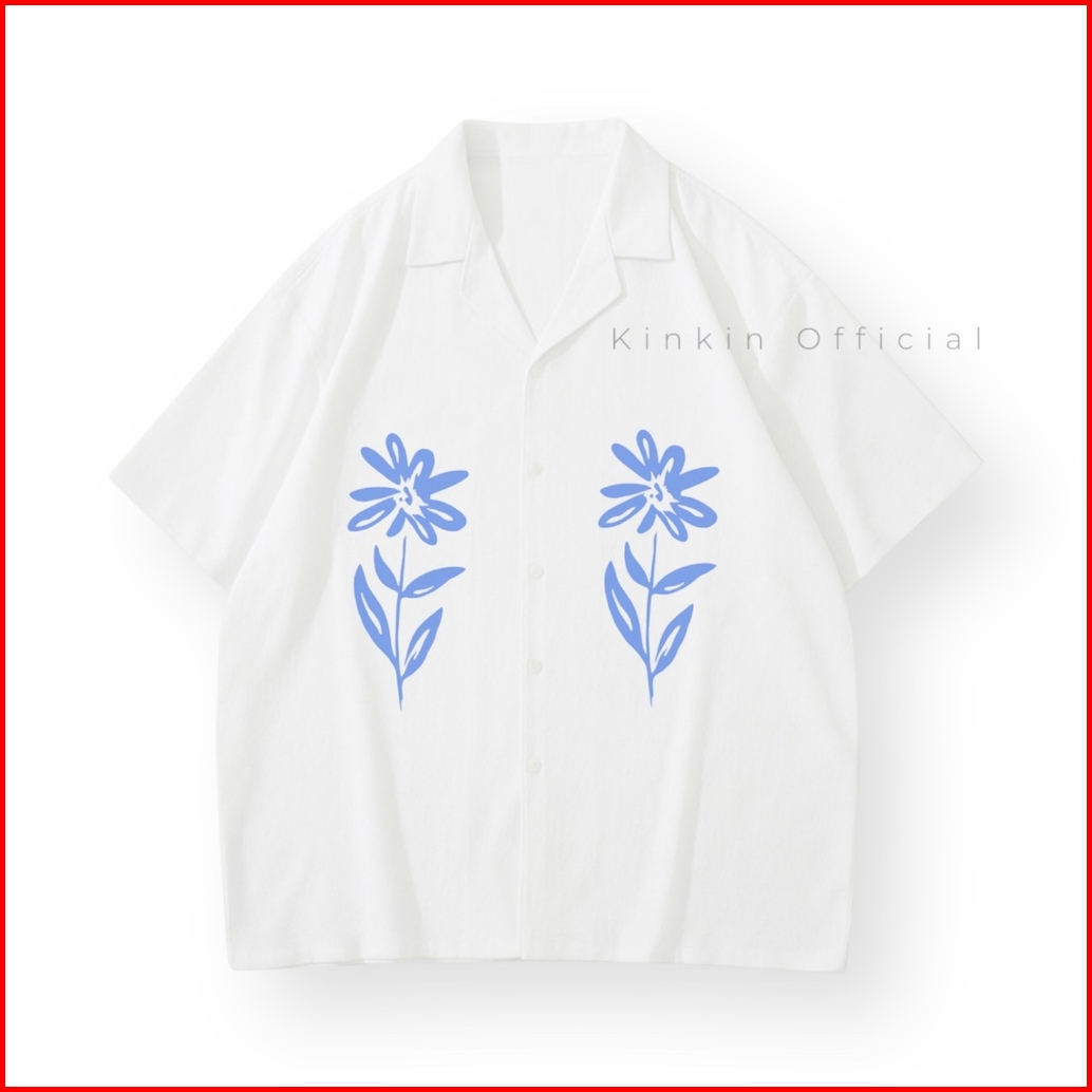 Kemeja Pria Vintage Kemeja Pria Wanita Hitam Putih Motif Bunga Biru Lengan Pendek Casual Aesthetic