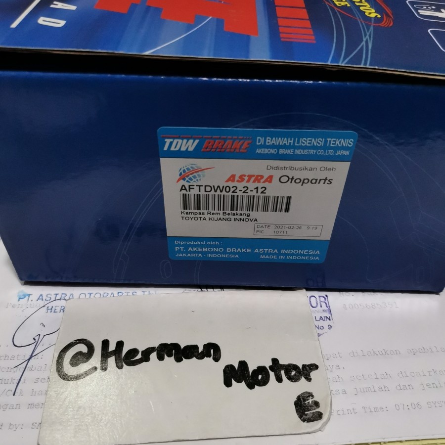 Kampas rem belakang TDW Original Innova 2004-2015 old- Barong Brake shoe AFTDW02-2-12 (dibawah license Akebono Brake Ind
