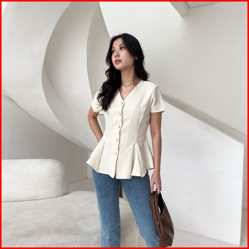 Erika Top Peplum Shirt Lengan Pendek Slim Fit Shirt Wanita Kemeja Vneck Wanita Kantor Pendek - Eleonor
