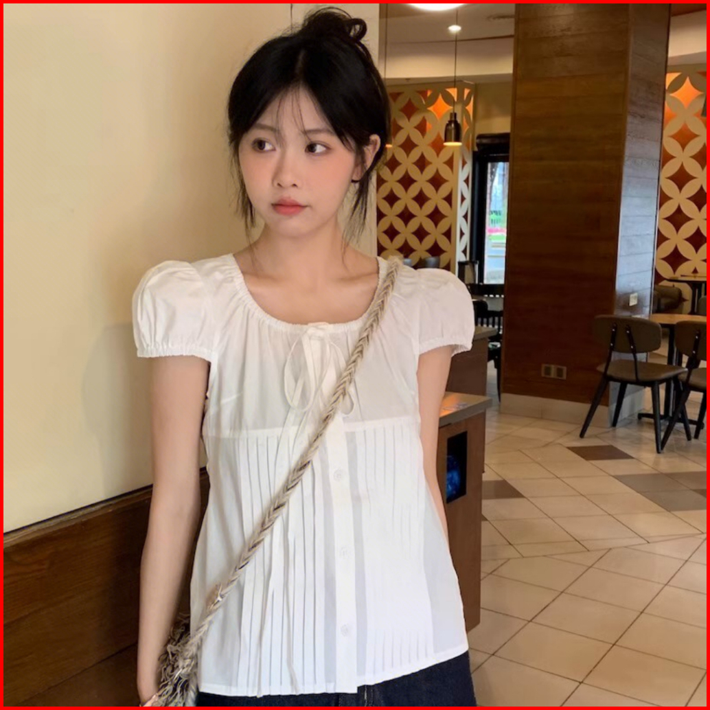 Blouse Putih Wanita Puff Sleeve Atasan Casual Korea Style Tali Depan Kekinian K056