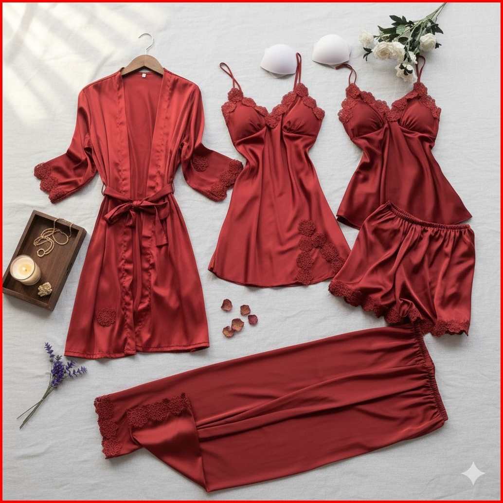 Piyama 5in1 Silk Sutra Set Kimono - Baju Tidur Silk Sutra Premium Import M L Xl Xxl