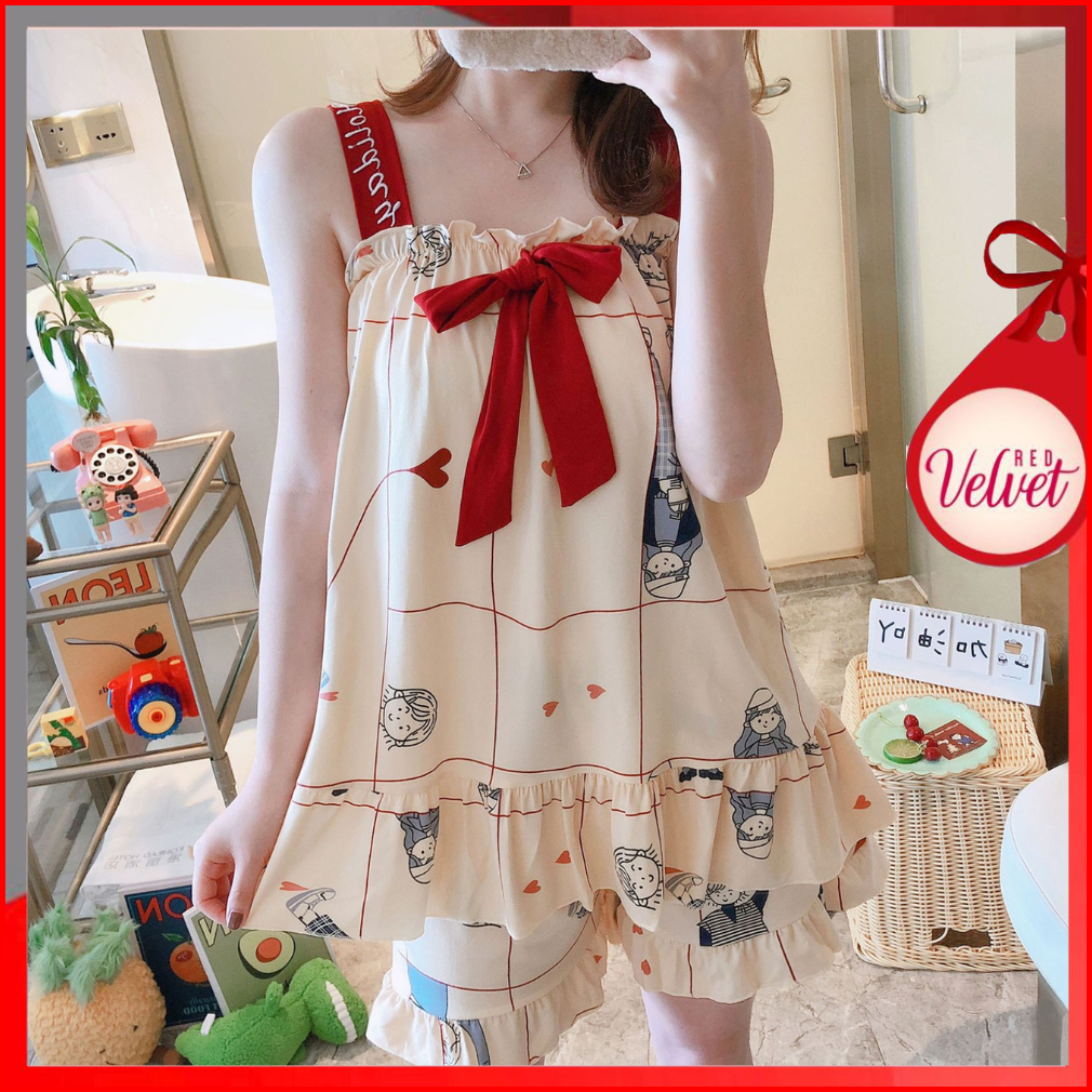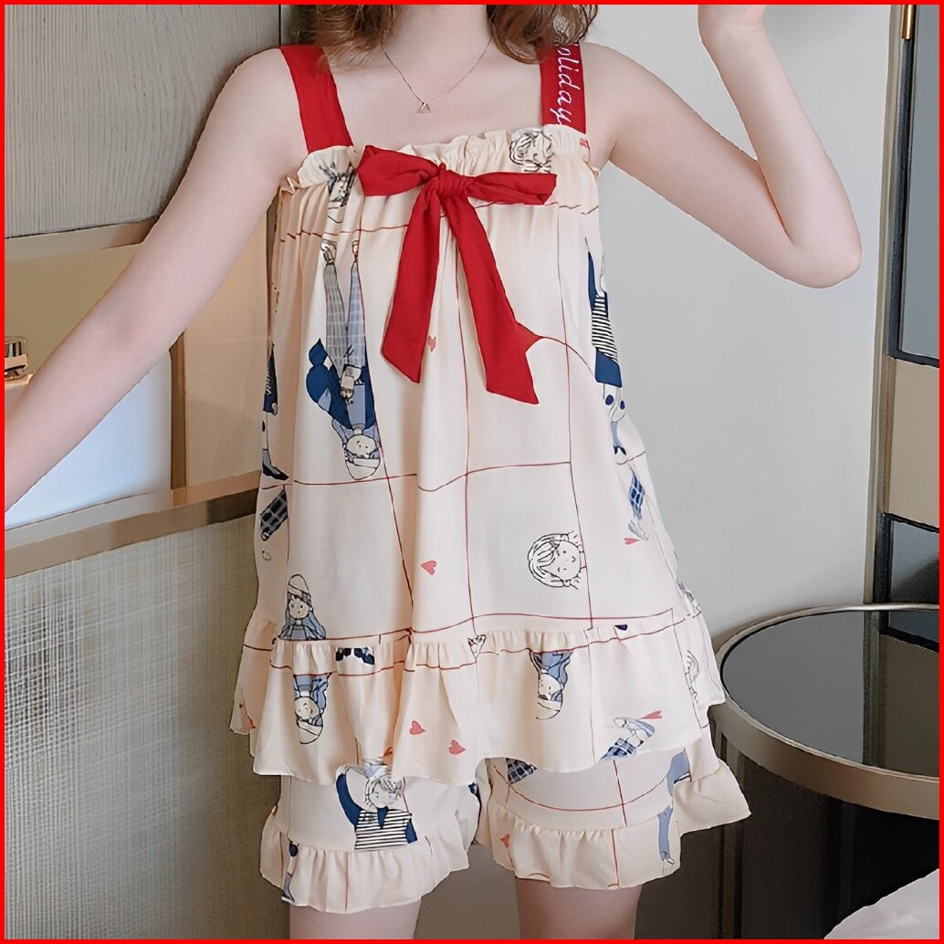 Rv Baju Tidur Wanita Piyama Baby Doll Setelan Perempuan Dewasa Tanpa Lengan Celana Pendek Remaja Desain Korea Motif Kart