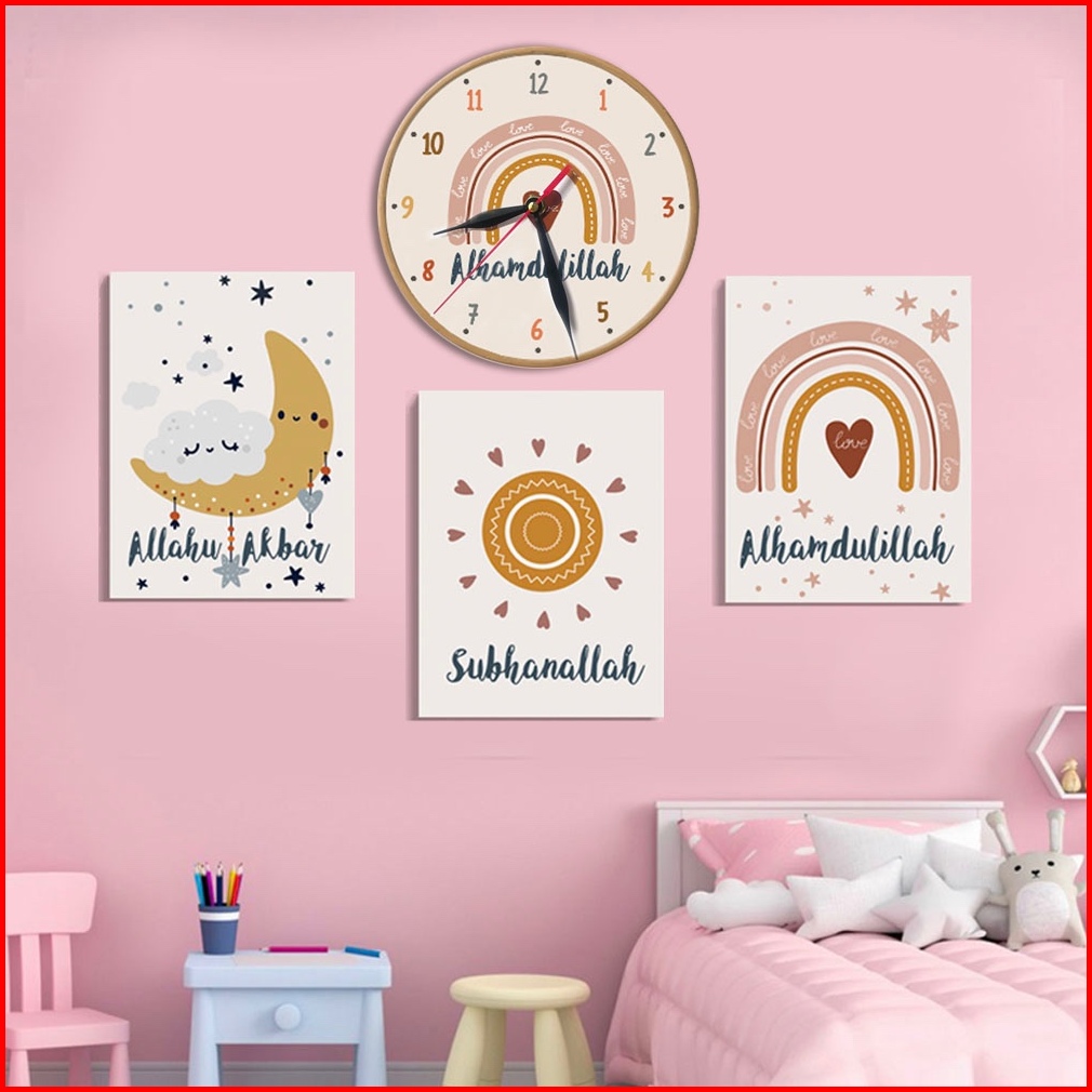 Jam Dinding Aesthetic Pelangi Set 4pc Hiasan Dinding - Dekorasi Kamar Anak Rainbow Poster Kayu