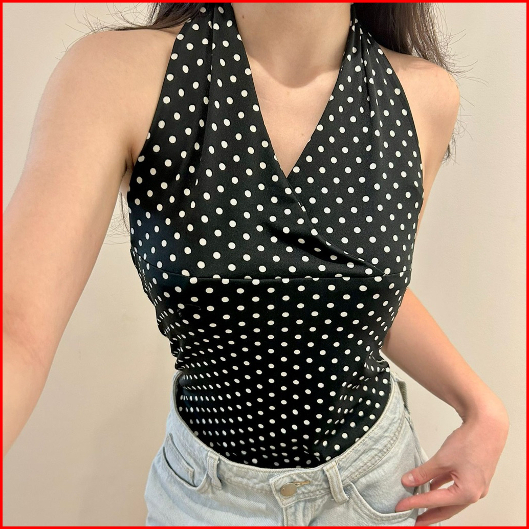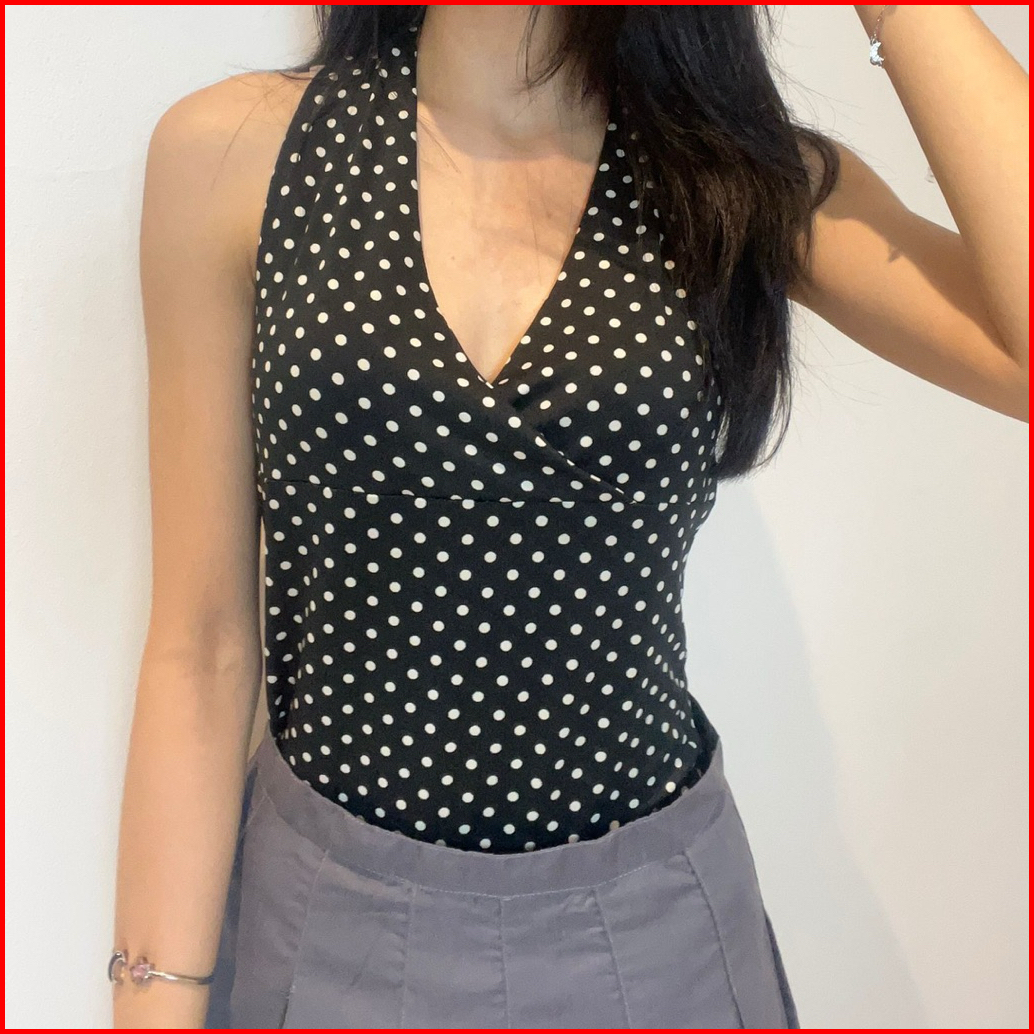 Juliet V-neck Halter Knot Polkadot Top Atasan Wanita Tanpa Lengan Polkadot Halter Pita Knot Twist Top Korean Basic Lenga
