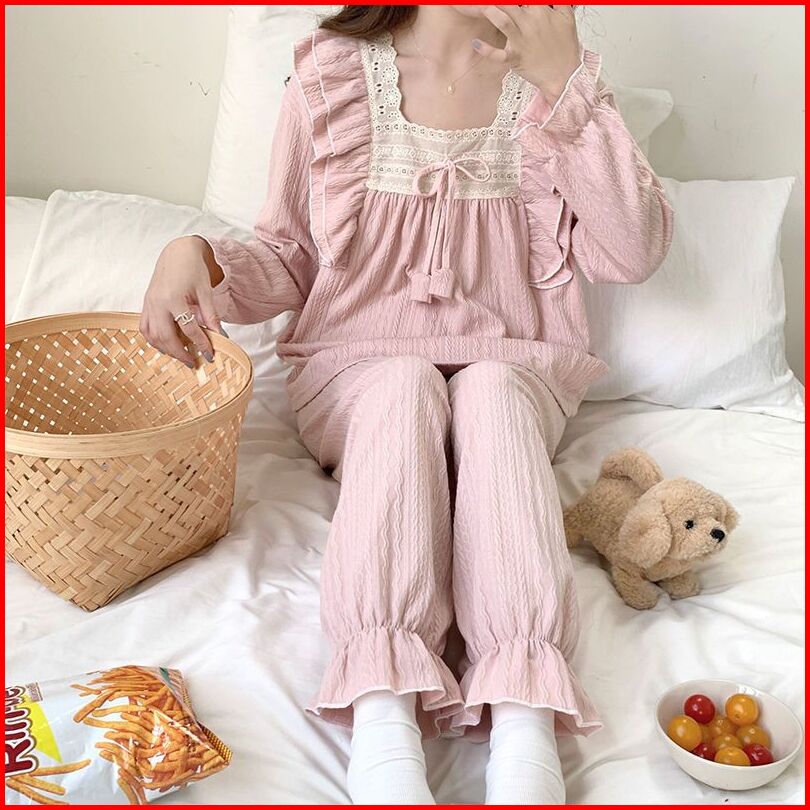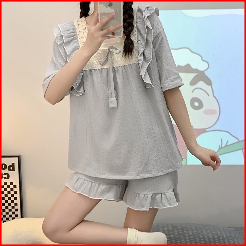 Baju Tidur Wanita Dewasa Hyomin Sleepwear Piyama Set Setelan Motif Pita Renda Ruffle Pakaian Tidur Lengan Panjang Pendek