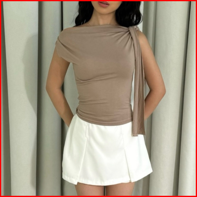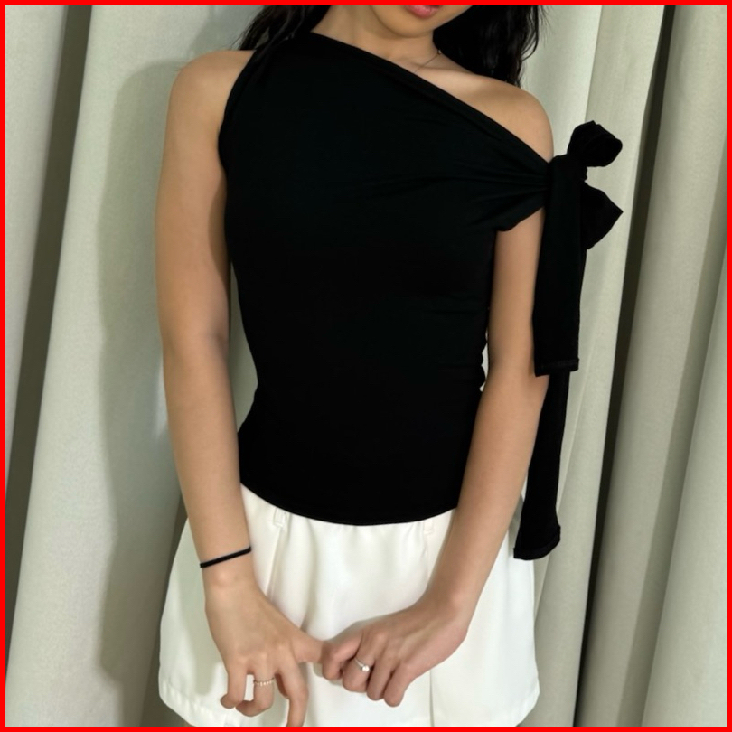 Knot Top Atasan Wanita One Shoulder Knot Twist Top Korean Basic Tanpa Lengan Asymmetrical Spandex Oasm