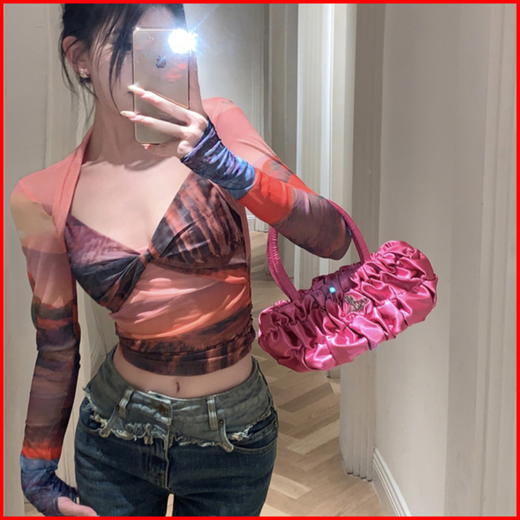 99koutlet Atasan Wanita Crop Top Lengan Panjang T-shirt V- Neck Mesh Transparant 2180 Baju Lace Kaos Sexy Tie-dye