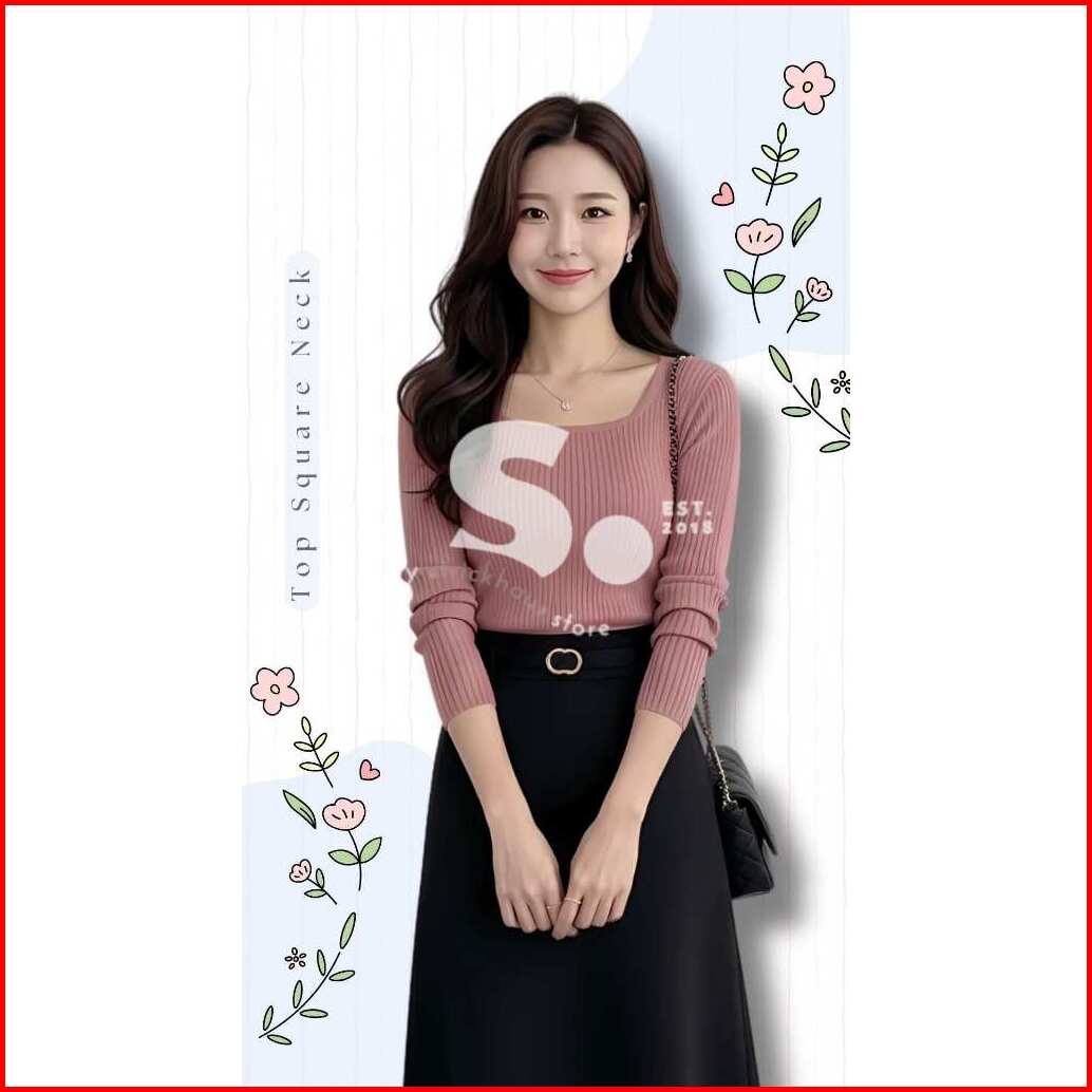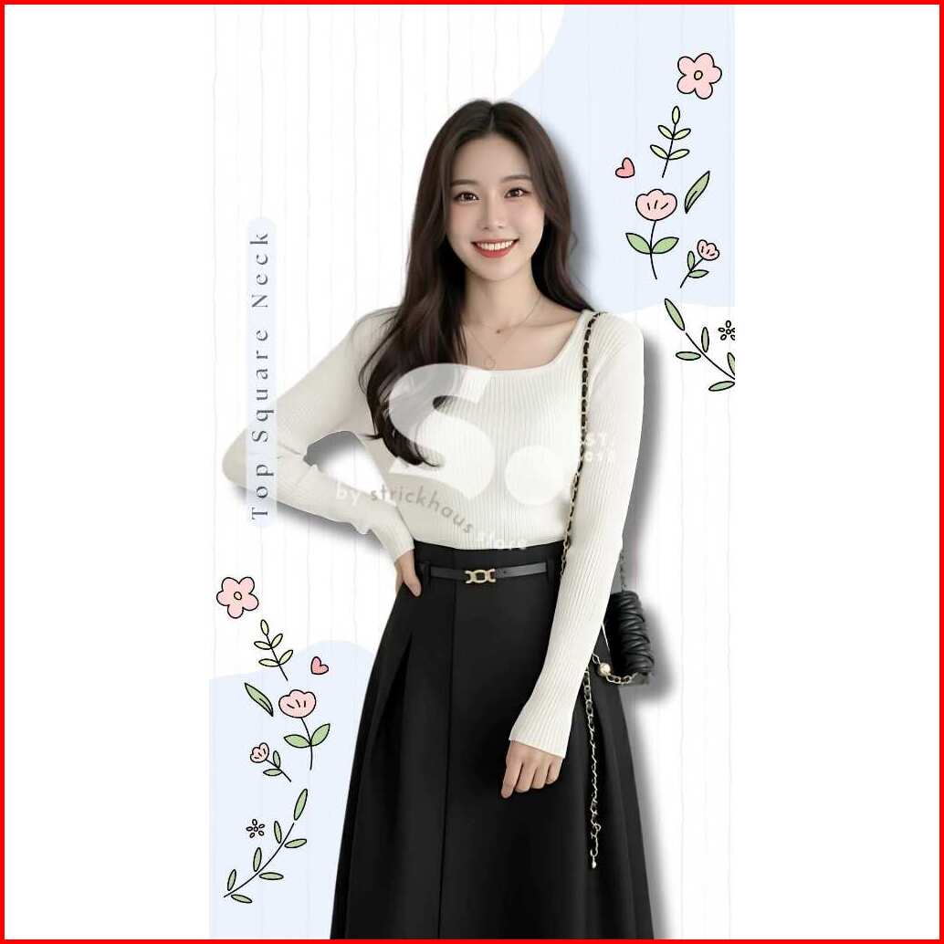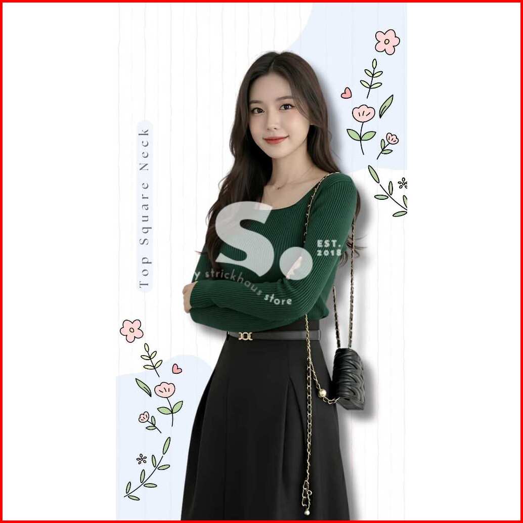 Square Neck Top Knit Long Sleeve Blouse Rajut Lengan Panjang Kerak Persegi
