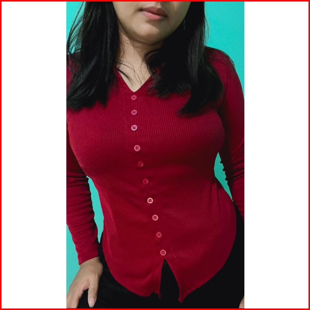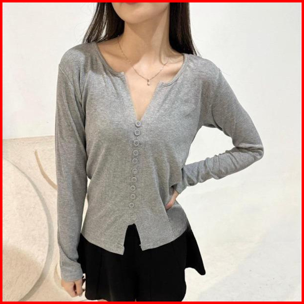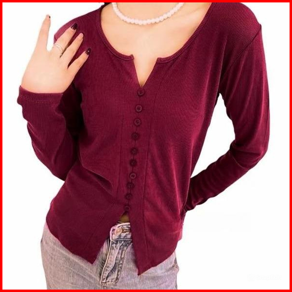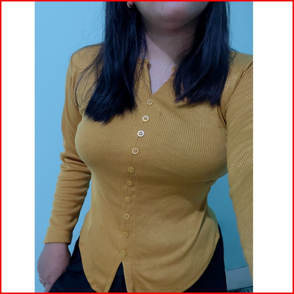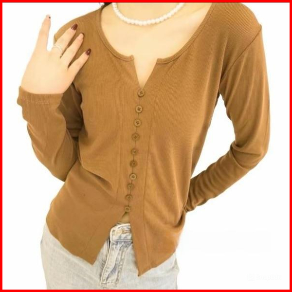 Blouse Rajut Wanita Longsleeve V Neck Lengan Panjang Rib Knit Casual Kancing Mati Variasi Knitwear
