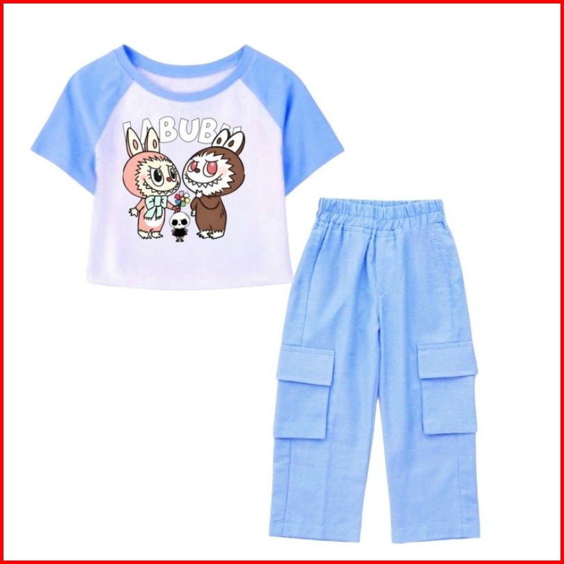 Setelan Kaos Celana Cargo Anak Perempuan Motif Labubu Flower One Set Cargo Anak Kekinian