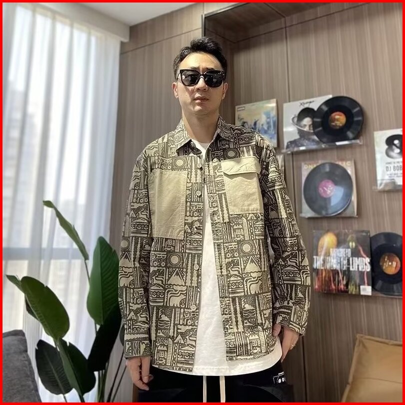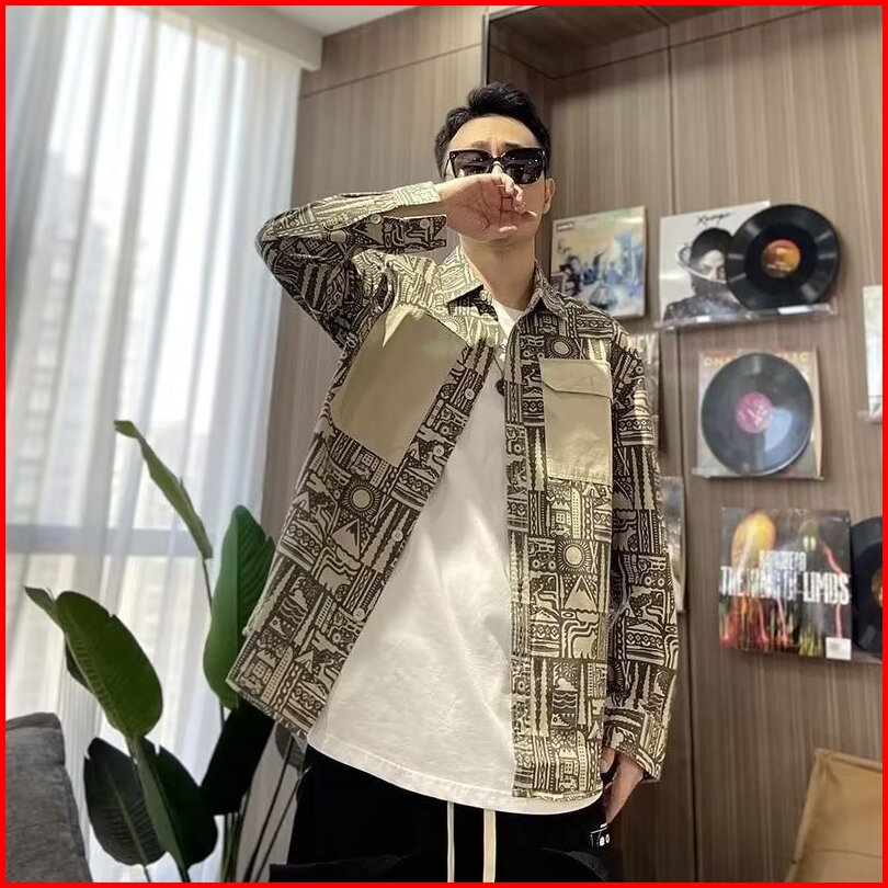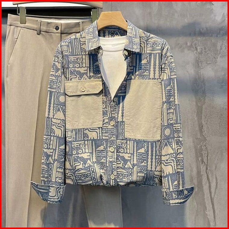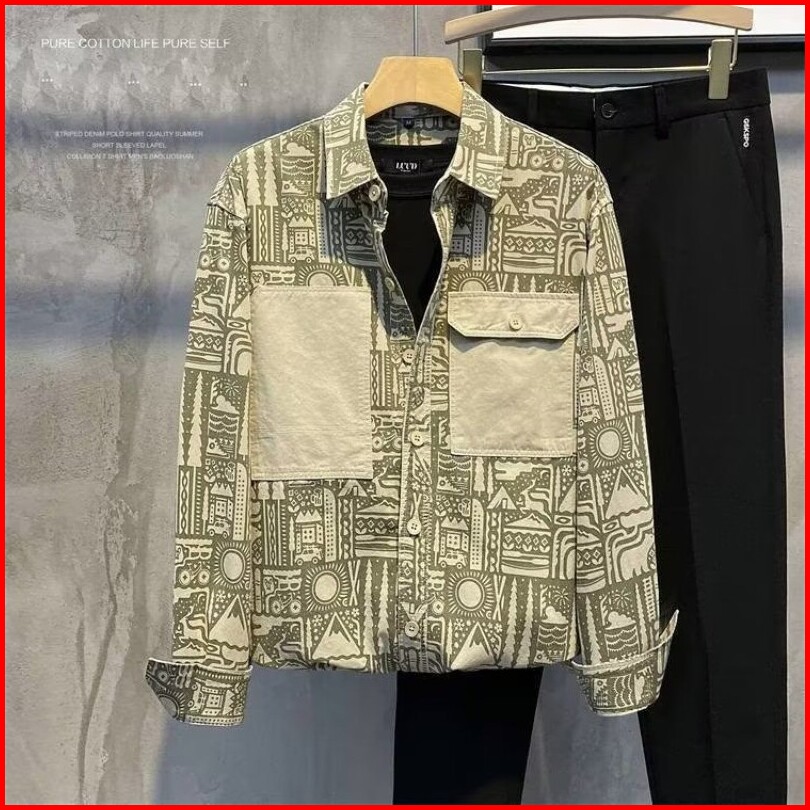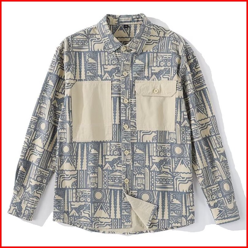 Graffiti Full Body Printed Long Sleeve Pocket Retro Oversize Shirt Casual Korean Japanese Style In Blue And Greee