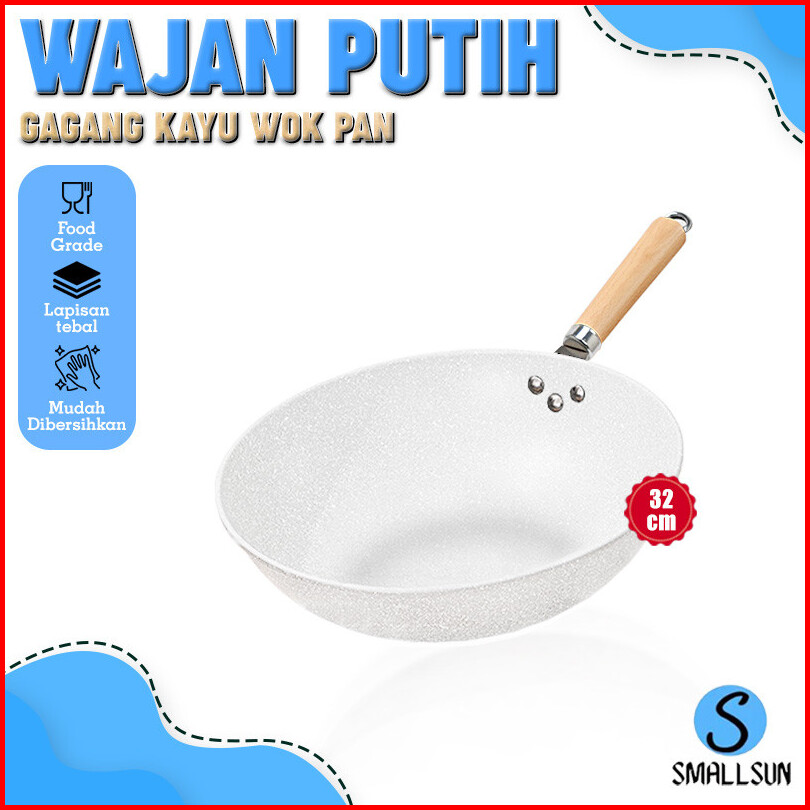 Ss Wajan Putih Gagang Kayu Anti Lengket 32cm Panci Wok Pan Penggorengan Serbaguna Premium
