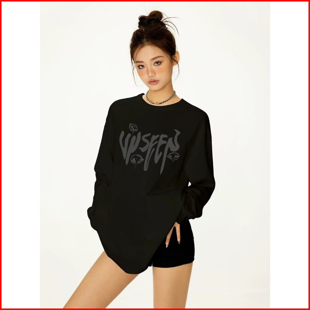 Boombap American Retro Style Lengan Panjang Oversize Grafiti Pribadi Print Top Lengan Panjang Wanita Hitam Baju Atasan W