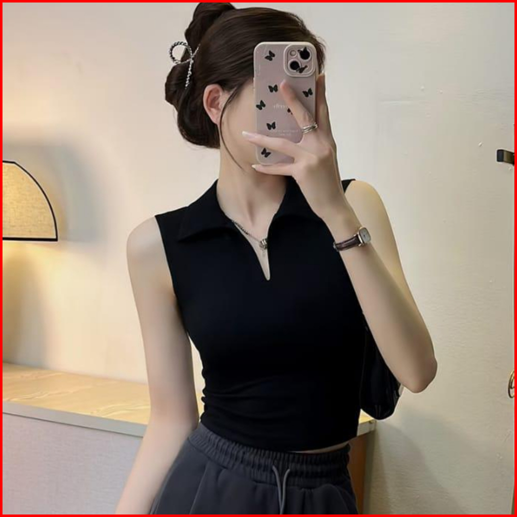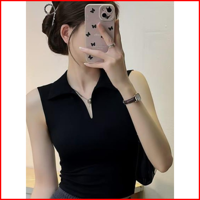 Df - Tanktop Halter Crop Wanita Rossi Kerah Korean Style Kekinian V Neck Knit Rib