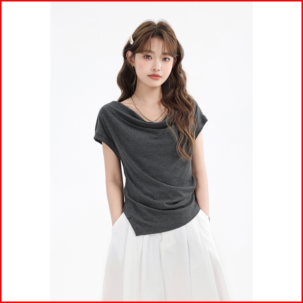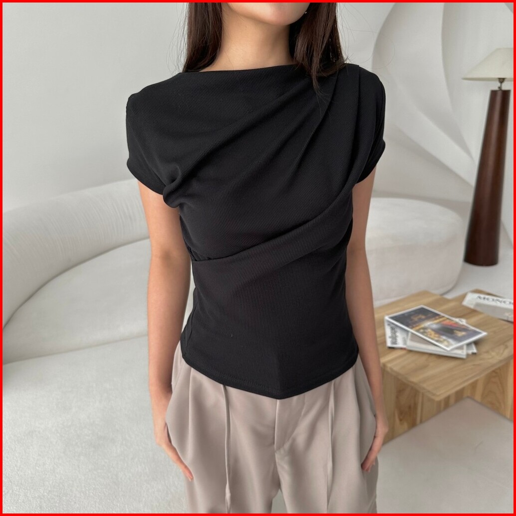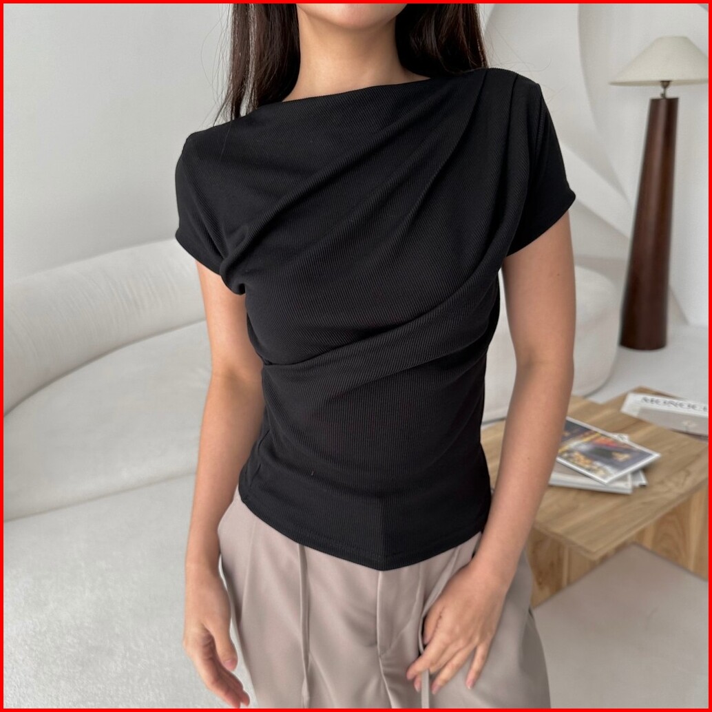 Tara Top - Atasan Kaos Wanita Basic Lengan Pendek Boat Neck Wanita Korean Top Baju Summer Knit Rib Long Short Sleeve Qpz