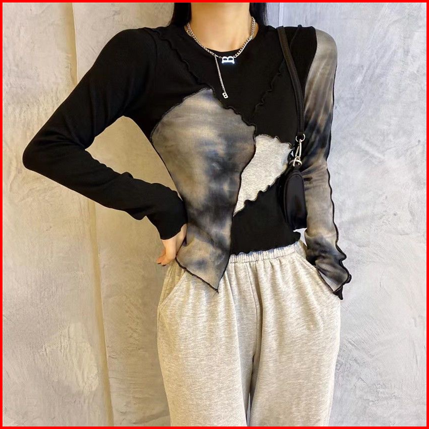 Monica American Top Continental Diwarnai T-shirt Slim Top Wanita Lengan Panjang