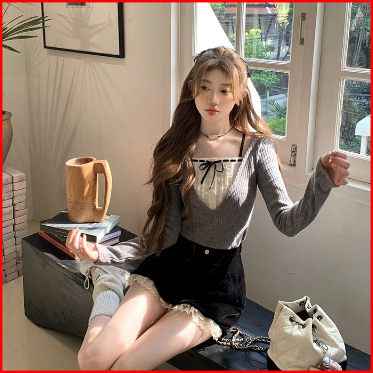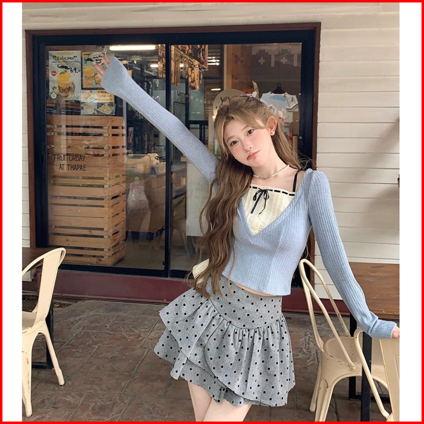 Atasan Patchwork Abu-abu Korea Biru Lengan Panjang Top Manis Dan Nyaman
