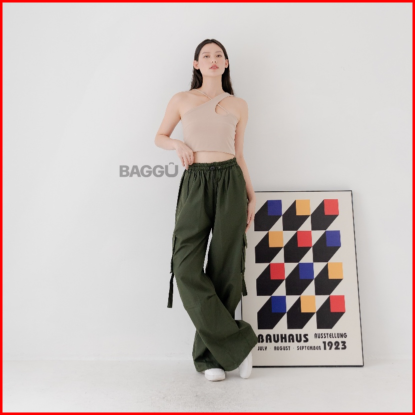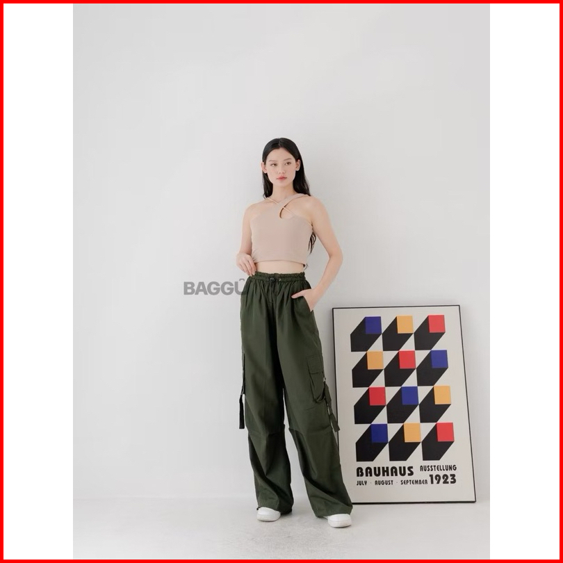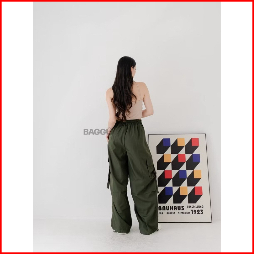 Baggu Cargo Pants Jennie - Army - Celana Cargo Nylon Parasut Panjang Loose Pants Streetwear Korean Style